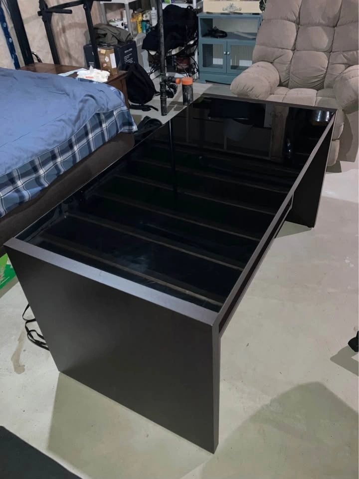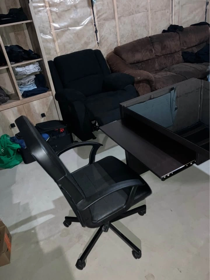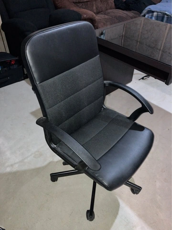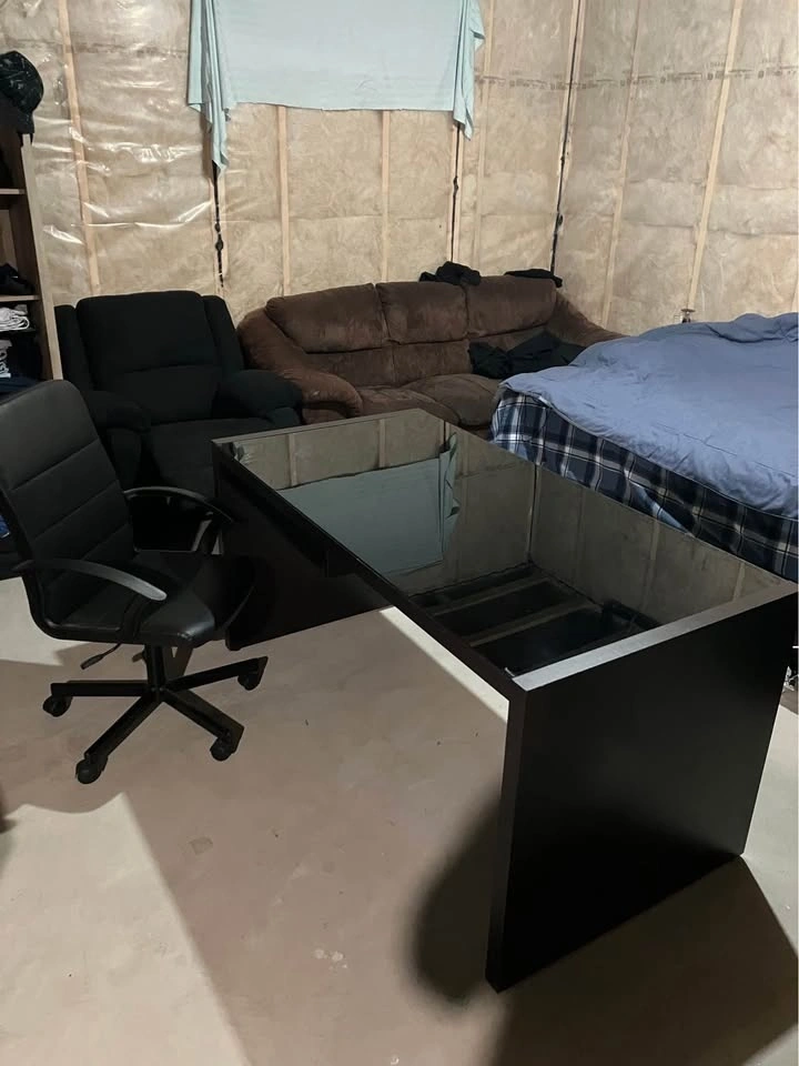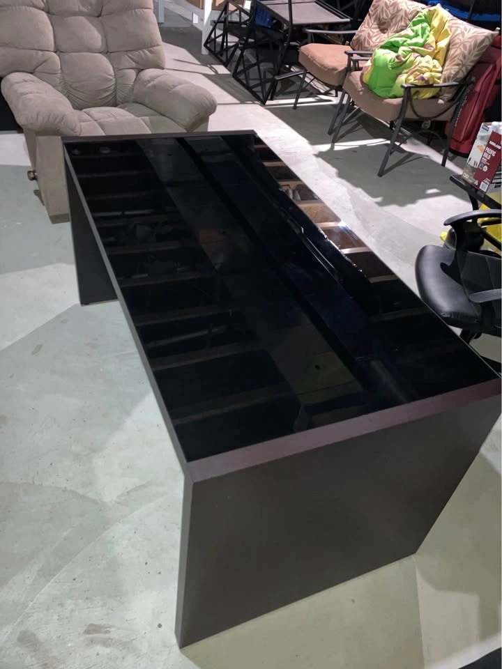 A sturdy/solid desk, in a good used condition. Tempered glass is scratch free and comes off, chair comes with extra wheels. Will help you load.