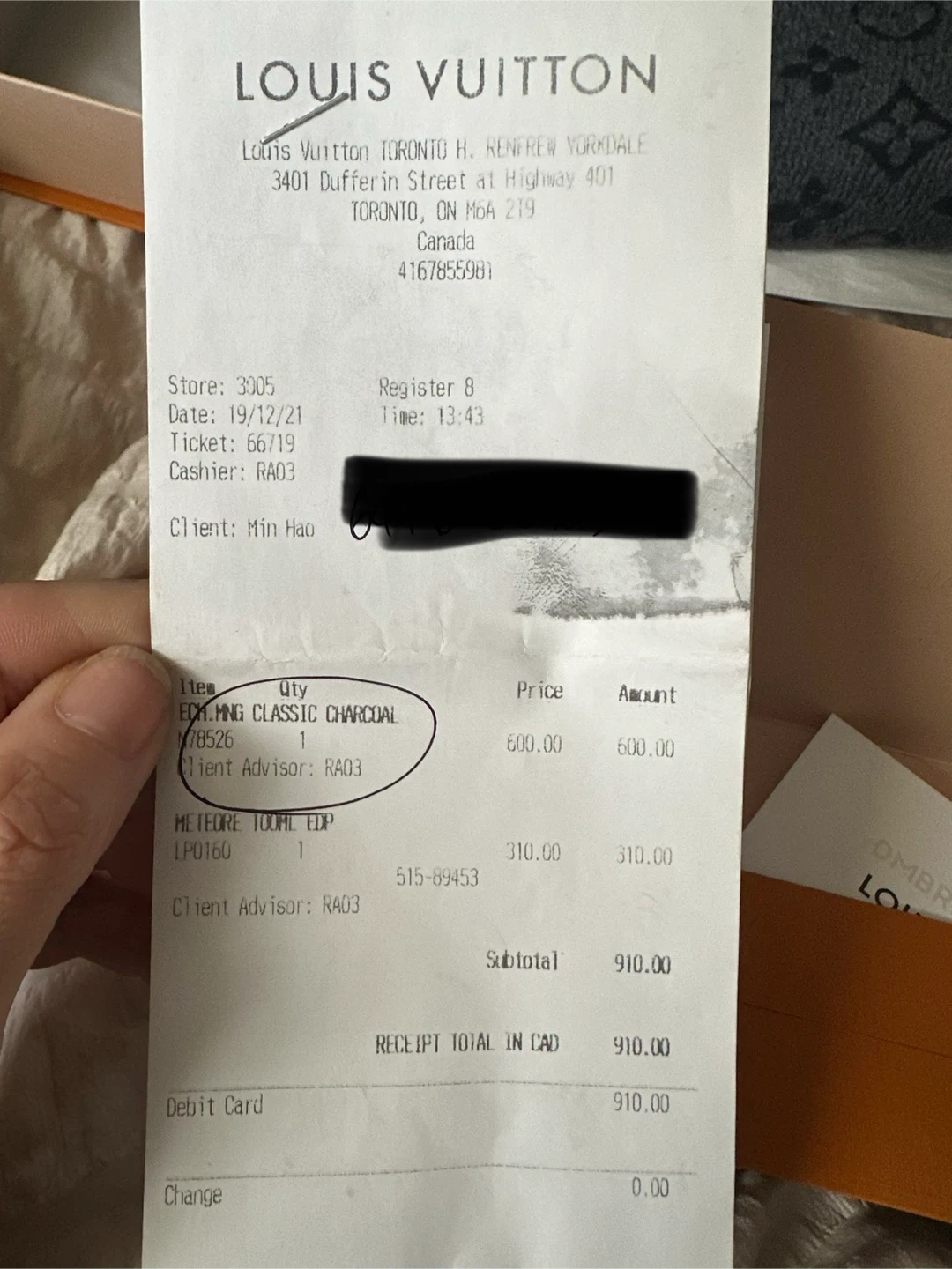 Selling a Louis Vuitton Echarpe Classic scarf in charcoal! It's in excellent condition and comes with the box. The receipt indicates that it was originally purchased for $600 CAD. A stylish and warm accessory for the colder months!