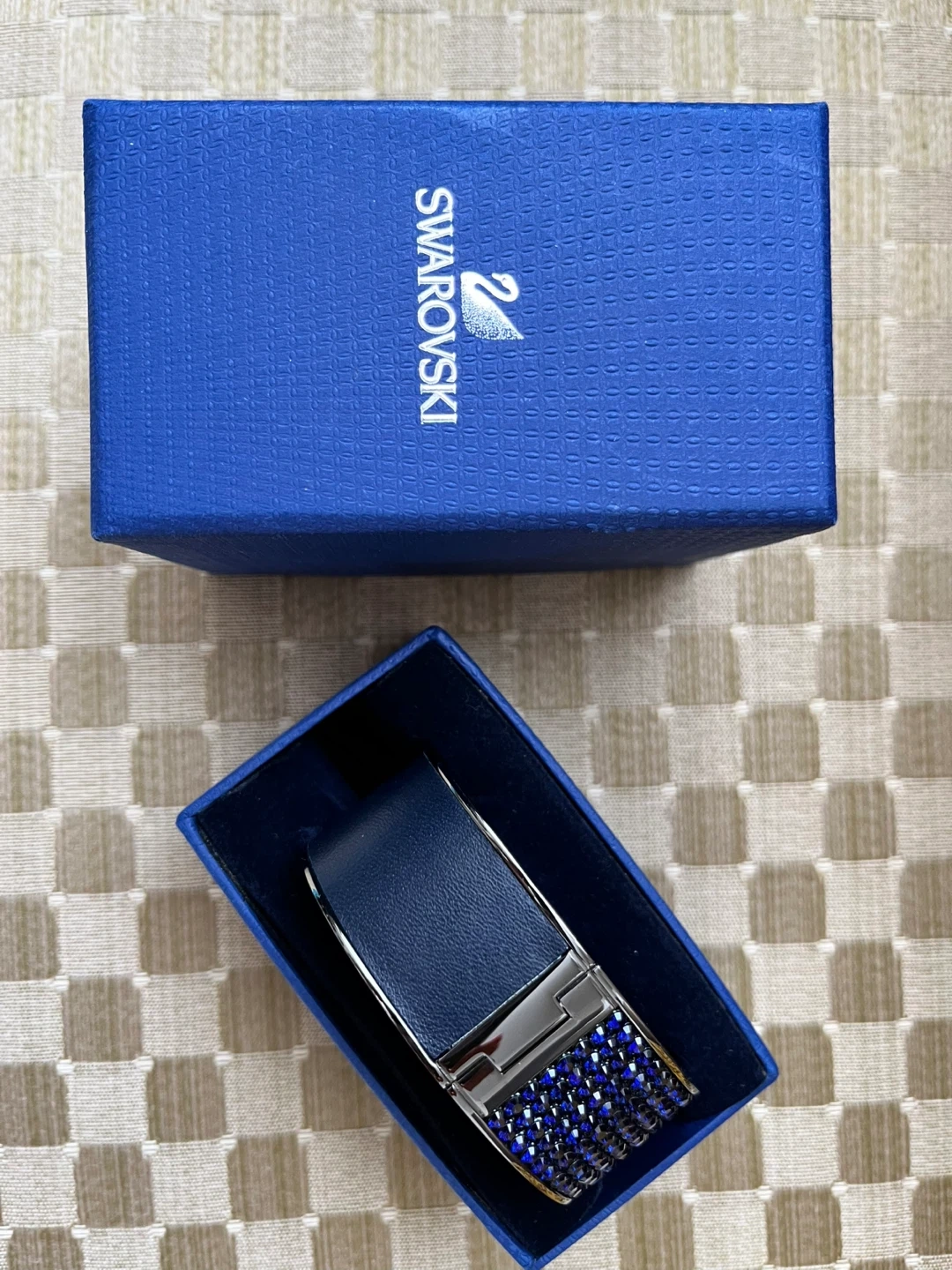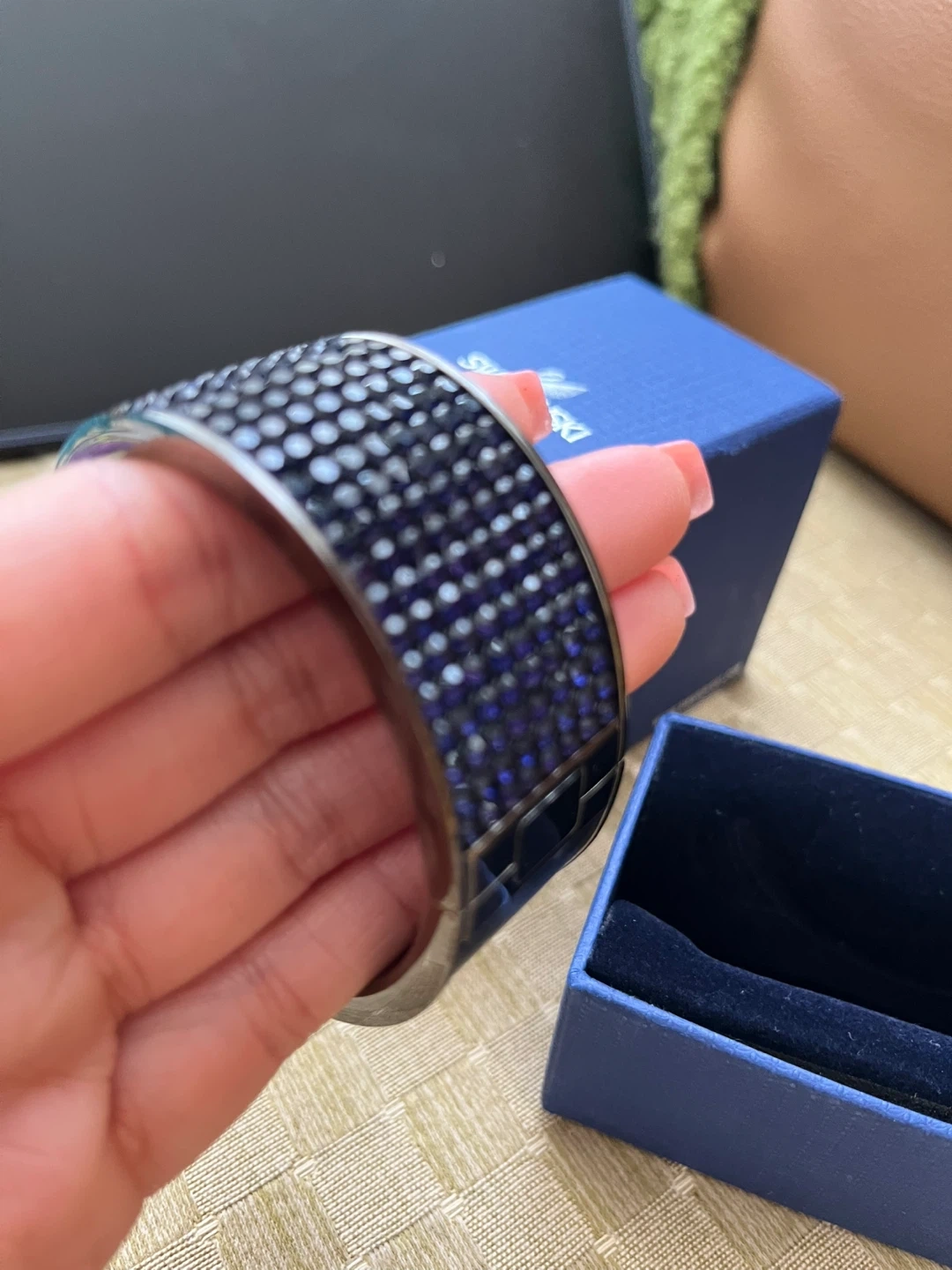 Selling a beautiful Swarovski bangle bracelet. It features a row of sparkling blue crystals. Comes with its original box!