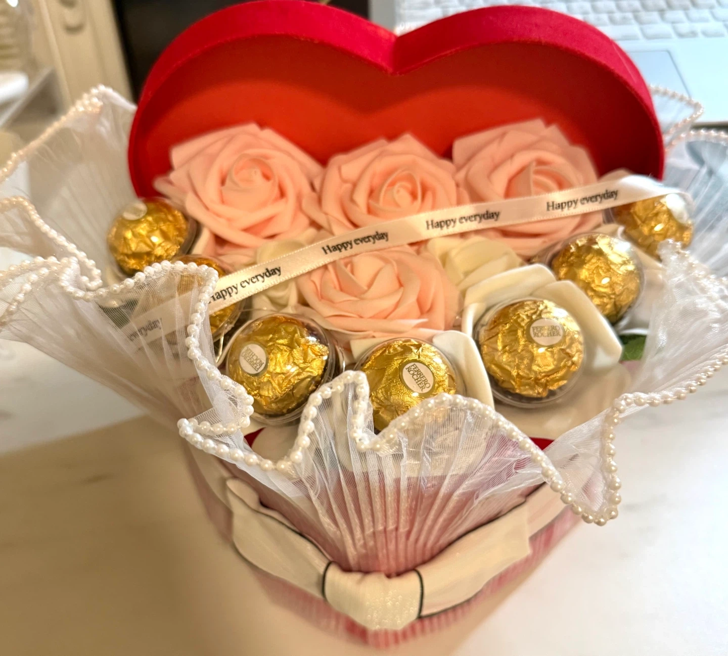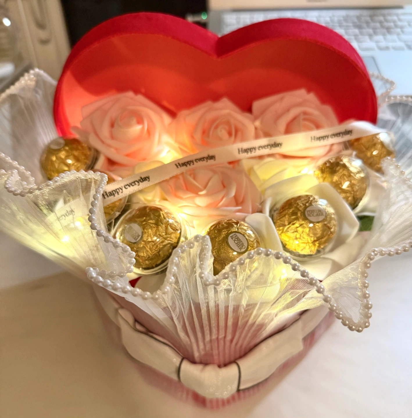 A lovely Ferrero Rocher chocolate bouquet, perfect for a gift or special occasion! It features 7 delicious Ferrero Rocher chocolates arranged with delicate 6 eternal roses and decorative accents. The bouquet comes in a heart-shaped box and lights that have 3 adjustable settings.