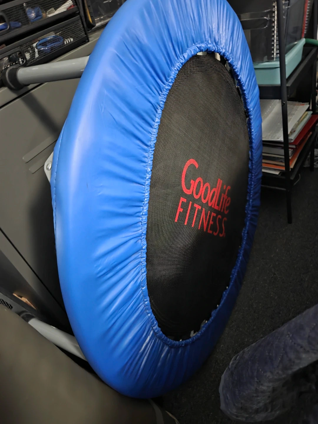 Selling a GoodLife Fitness mini trampoline! It has a blue cover and a black rebounding surface. Great for getting some exercise in a small space