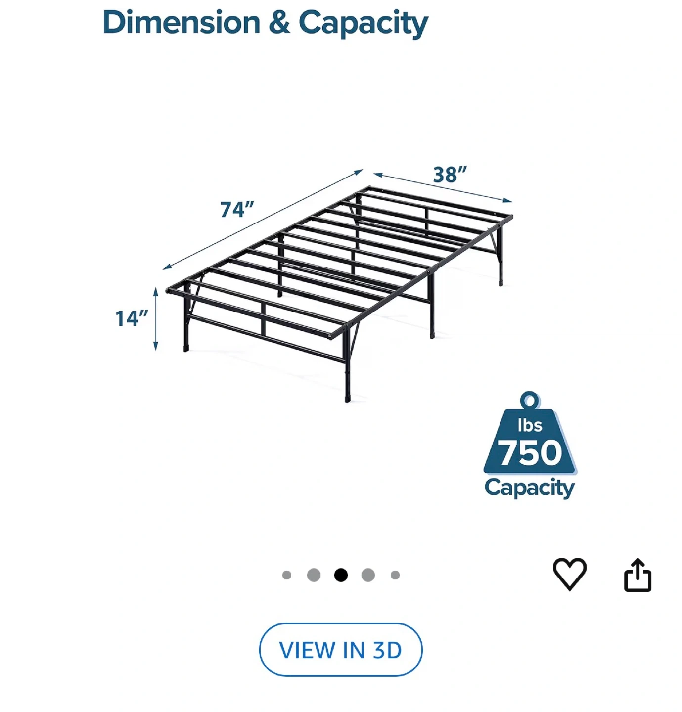 Selling a Zinus SmartBase 14-inch Metal Bed Frame (Twin Size) in excellent condition. This is a strong, minimalist, heavy-duty steel bed frame that does NOT require a box spring, making it a great value for students, renters, or anyone setting up a bedroom on a budget.