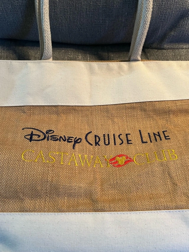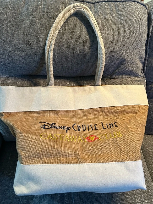 Pre-owned Disney Cruise Line Castaway Club beach bag, perfect for your next vacation or trip to the beach. The bag is in great condition. Spacious interior, sturdy rope handles, and features the Disney Cruise Line logo. Ideal for carrying towels, sunscreen, and other essentials. This charming bag is ready for new adventures! Priced at $40 CAD.