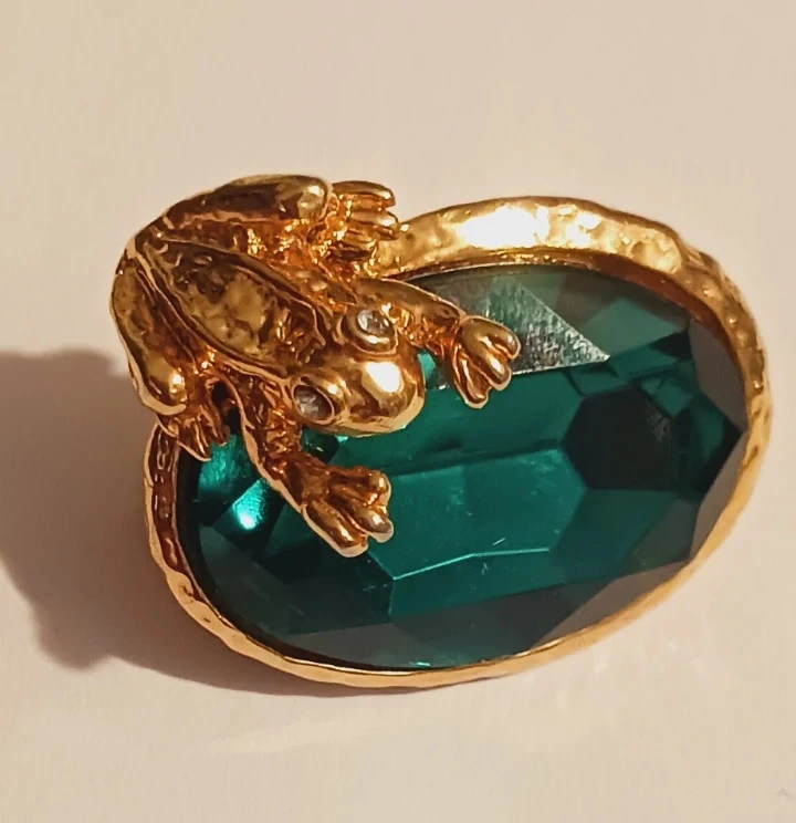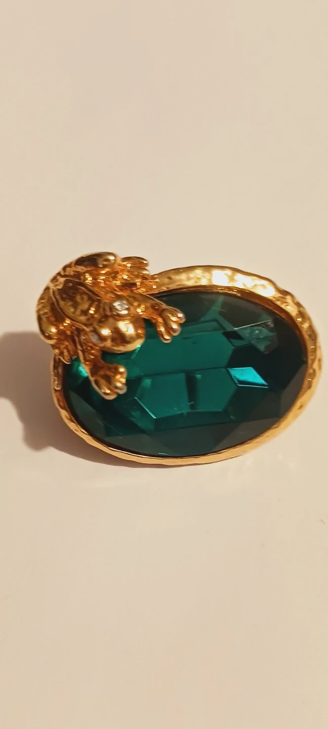 Here's a charming brooch featuring a golden frog perched atop a large, emerald-colored glass broich. It's a unique and eye-catching piece to add a touch of whimsy to any outfit. The gold tone complements the deep green of the stone beautifully !!! Excellent condition. ALL MY PRICES ARE NEGOTIABLE !!! This would make beautiful addition to your vintage jewelry collection !! It would make a great VALENTINE'S DAY GIFT 🎁 . 1.5"×1".