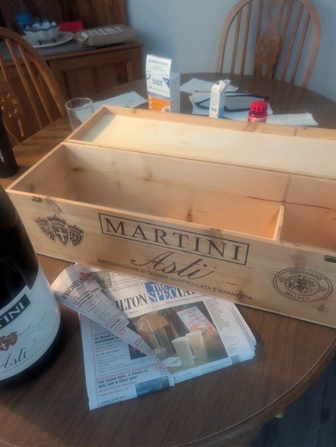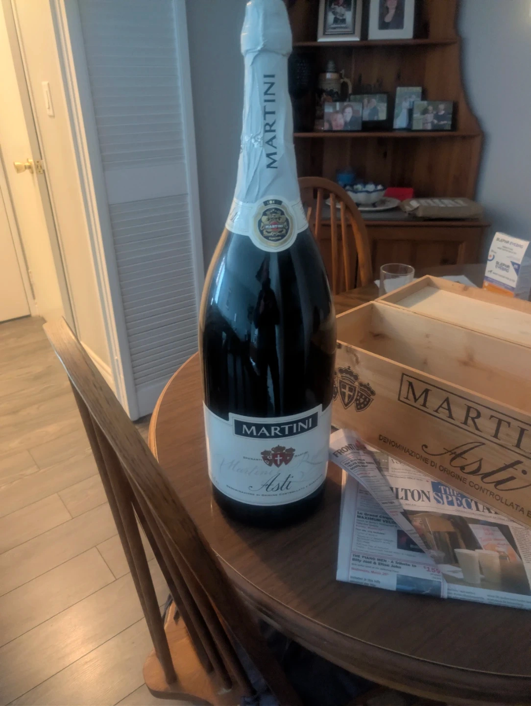 Designer decore masterpiece of modern home interior functional item and art all in one iconic brand Martini "Asti" Italy 6Liters of award winning 7% ABV sparkling champange this is 6as a beautiful special addition limited rare release for this far from Italy hand madewooden crate cask imprited with there iconic branding which is such a visual stunner for any home office,kitchen or bar and then the piece de resistance a functionally good ,still sealed "replica " bottle from there remarkably recieved and international best design aware winner in a rare larger then life show piece decorative model of the 7abv asti Platinum addition release . All contents original and not duplicated or replica , original everything