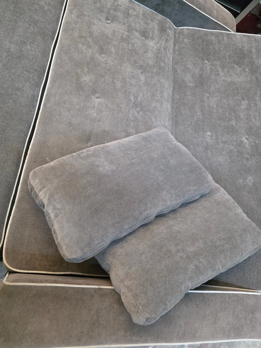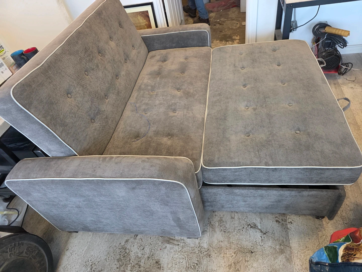 Selling a comfy grey sofa bed! It features a convenient pull-out trundle, perfect for guests or maximizing space. The sofa has a stylish design with button detailing. It's in good condition and ready for a new home!