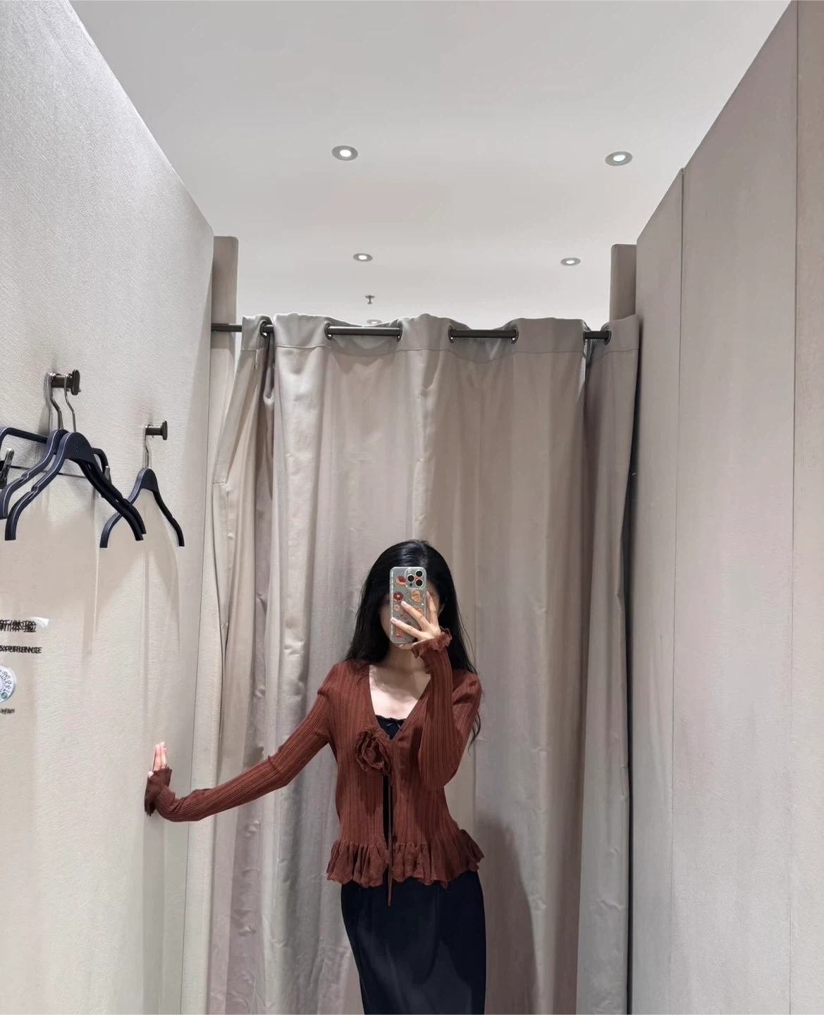 - Brown ribbed long-sleeve top with ruffle details. Size S.
