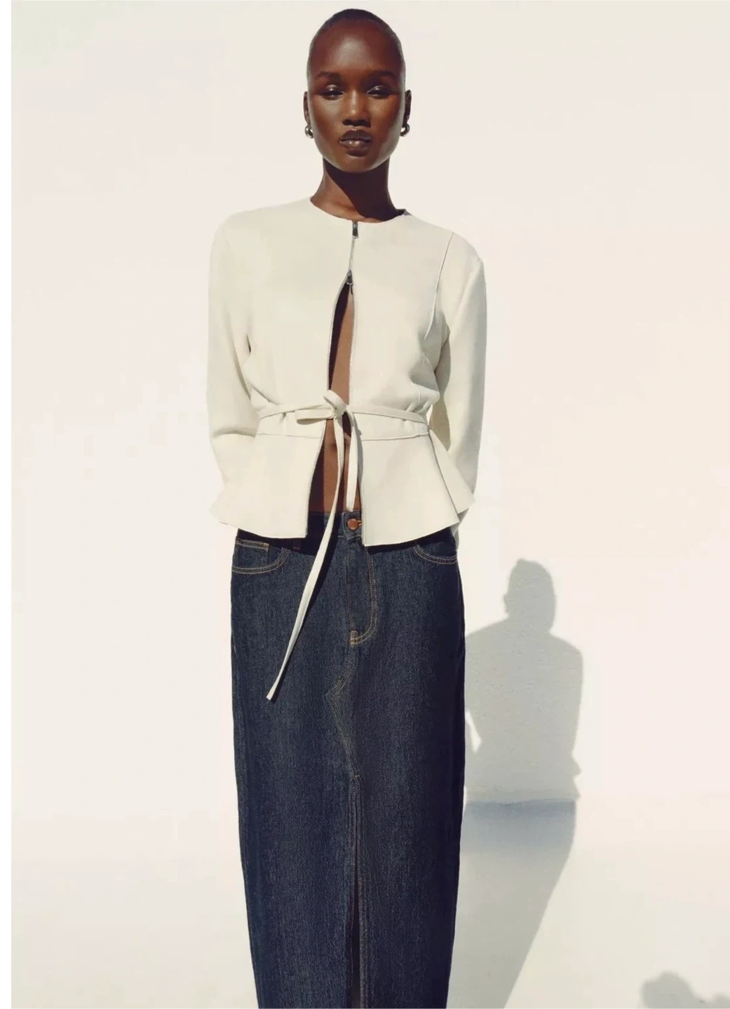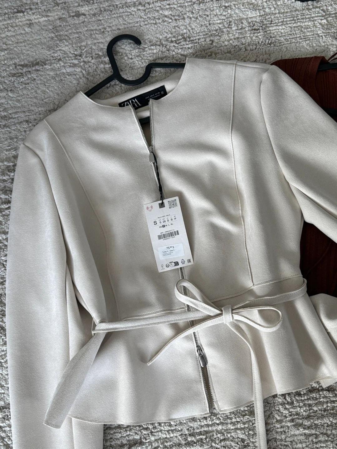 - Beige peplum jacket with a tie waist. Double side zippers. Size S.