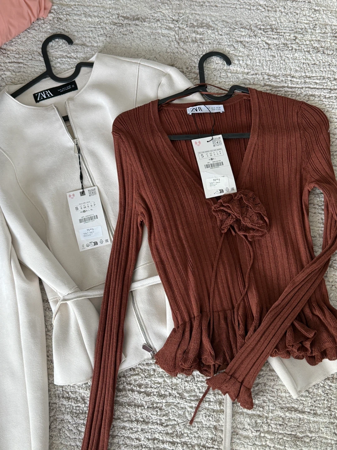BOGO: Beige Peplum Jacket & Brown Ribbed Top - Size S