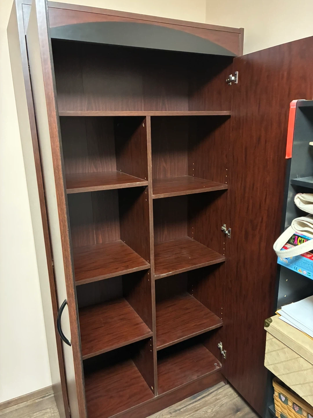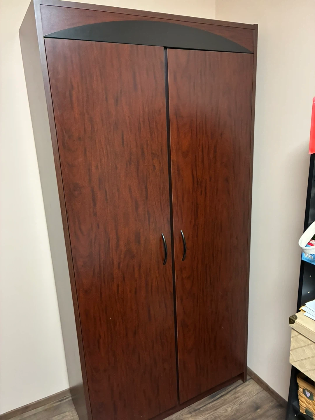 Selling a wooden wardrobe/armoire in good condition. It features a dark wood finish with black accents on top. The interior has multiple shelves for organized storage. Perfect for adding extra closet space to any room! Can also be used for supplies, crafts, almost anything