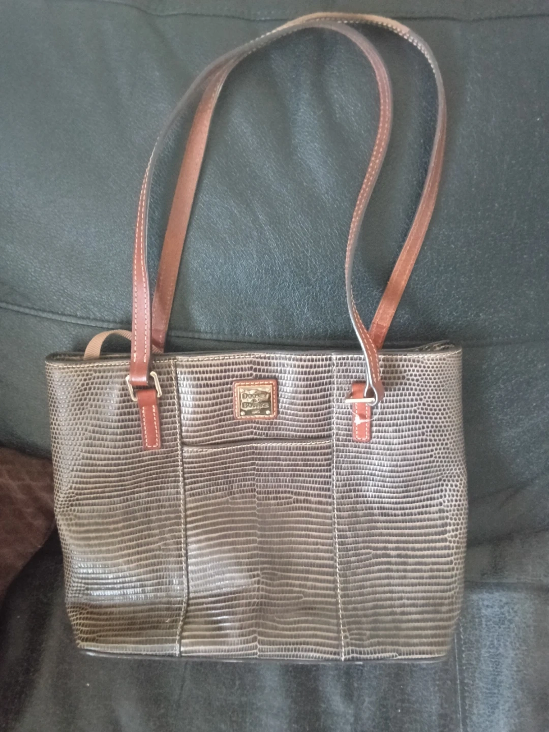 Dooney & Bourke tote bag with a unique textured pattern. The bag features brown leather straps and trim, complemented by a silver-toned logo plaque. It's in good condition and ready for a new owner