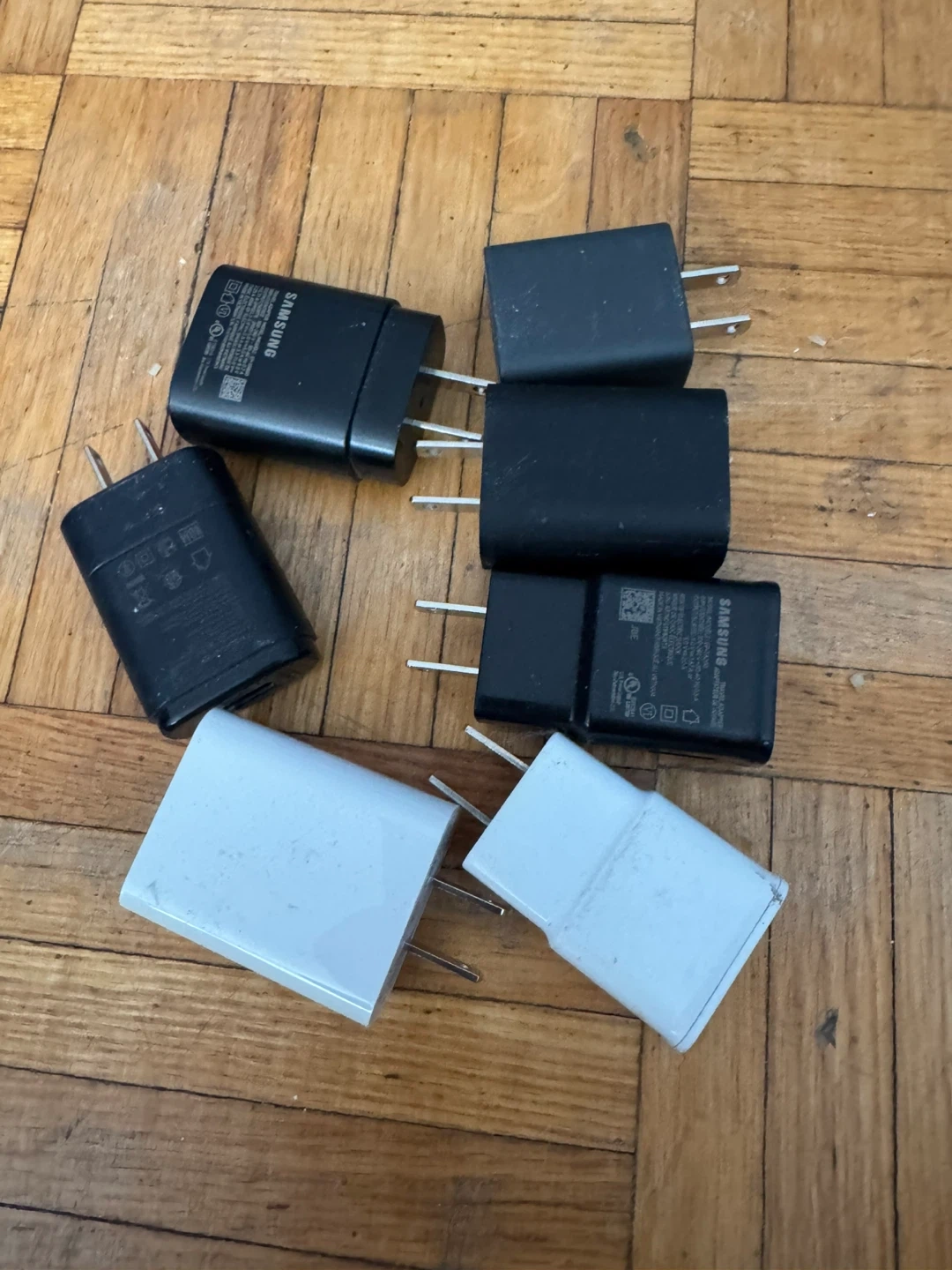 a collection of used phone chargers in both black and white. They're all in working condition and ready to power up your devices! Perfect as spares or replacements.