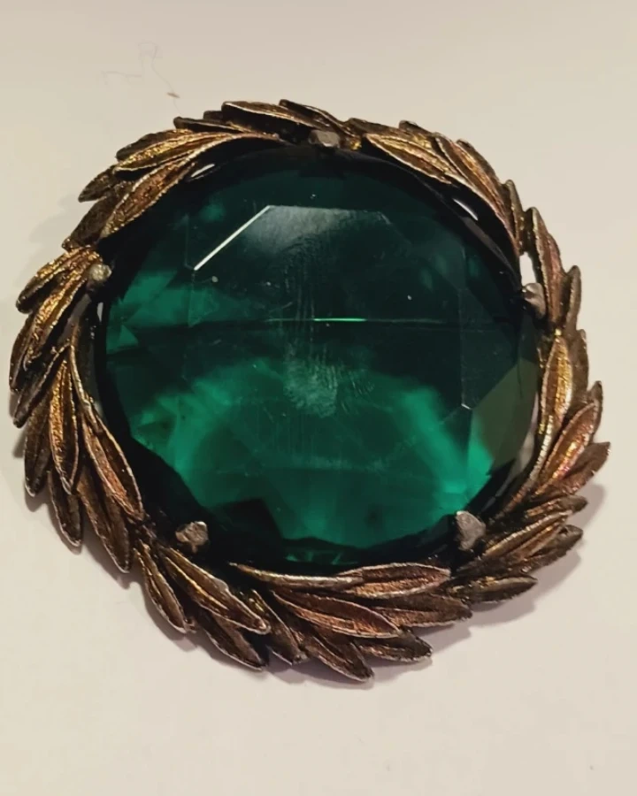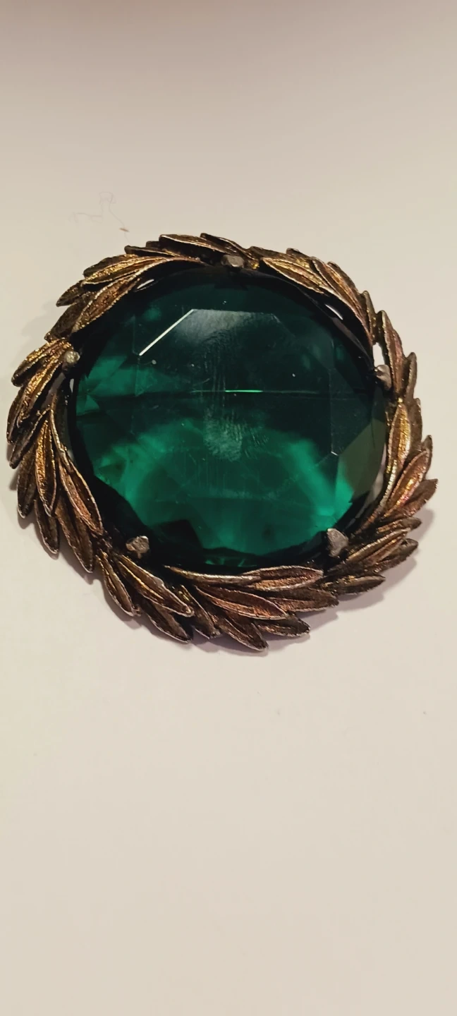 Gorgeous vintage brooch/ Pendant in one featuring a large emerald green glass stone. It has a decorative silver tone metal setting with a leaf design. It's a unique and eye-catching piece!!! 2.3" diameter. Excellent condition. ALL MY PRICES ARE NEGOTIABLE !!