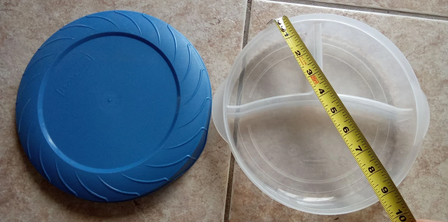 Selling a Rubbermaid Easy Find Lid food storage container. It's in good condition and measures approximately 9 inches in diameter. Perfect for meal prepping or storing leftovers!