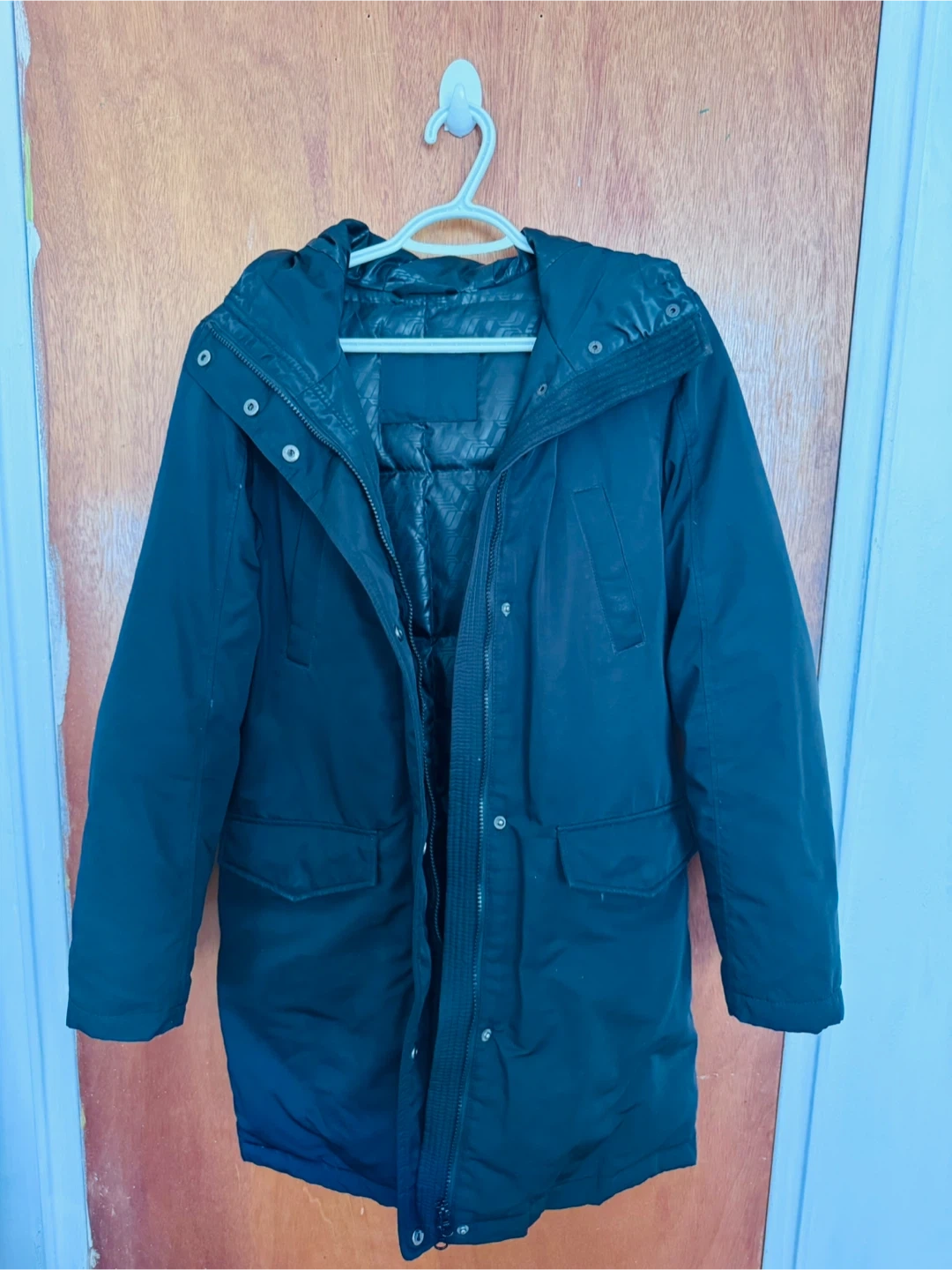 Selling a black winter coat. It's in great condition and perfect for the cold Canadian weather. It features a full zipper and button closure, a hood, and multiple pockets for storage. A stylish and functional addition to your winter wardrobe!