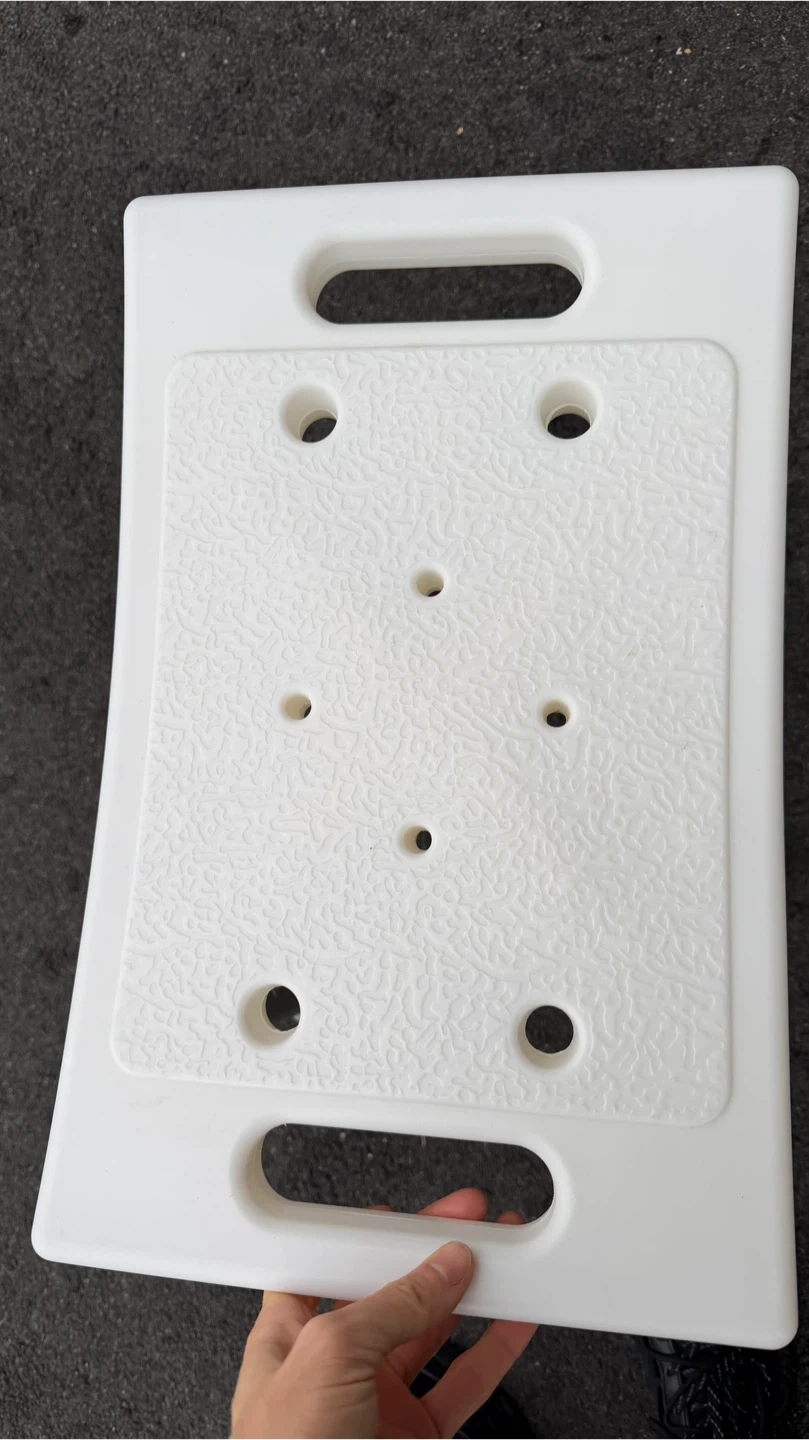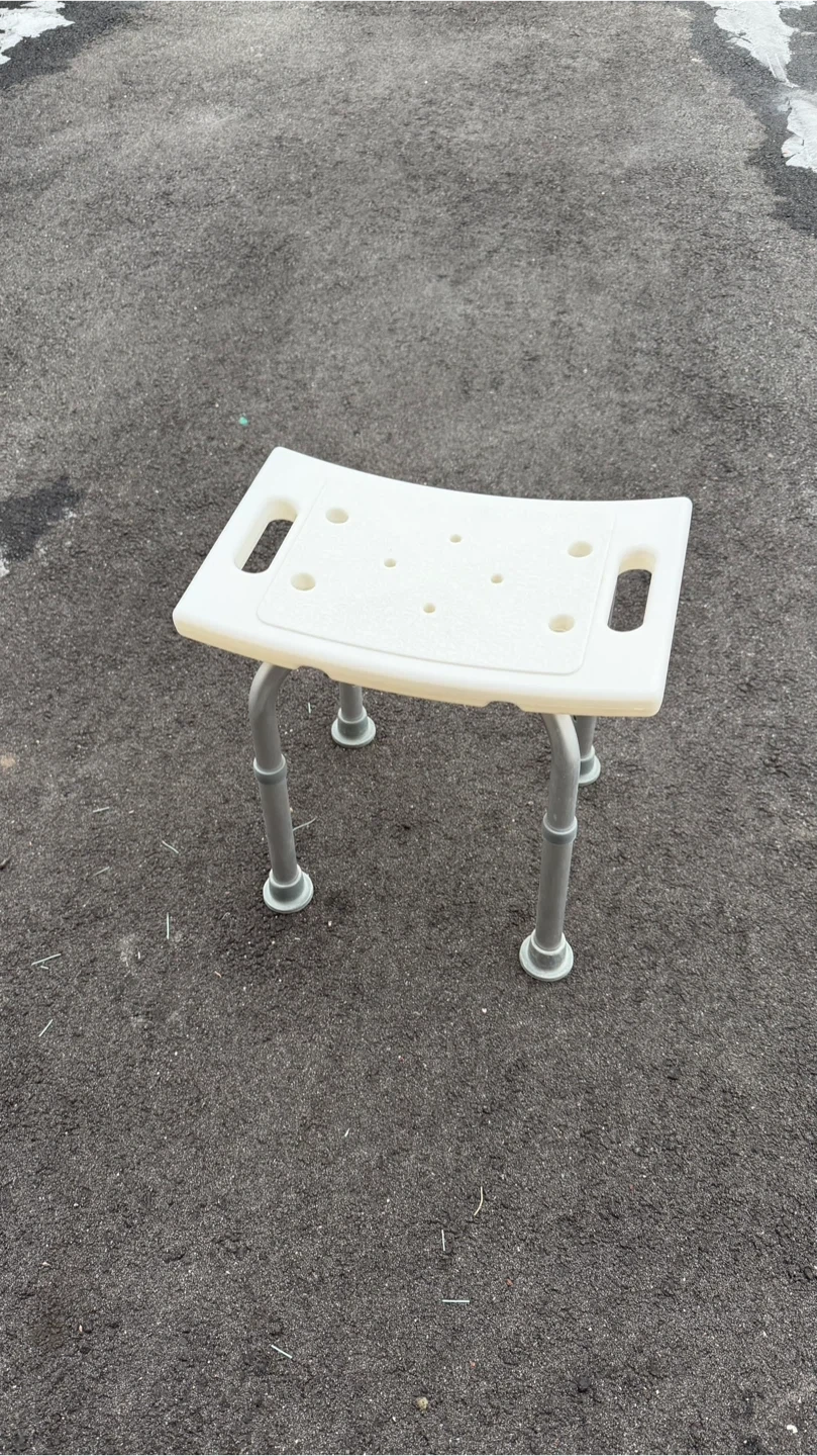 Selling a bath/shower chair with adjustable height legs. It's in good condition and ready to use! The chair is white with silver legs and features a textured seat with holes for drainage and handles on either side for easy grip and stability