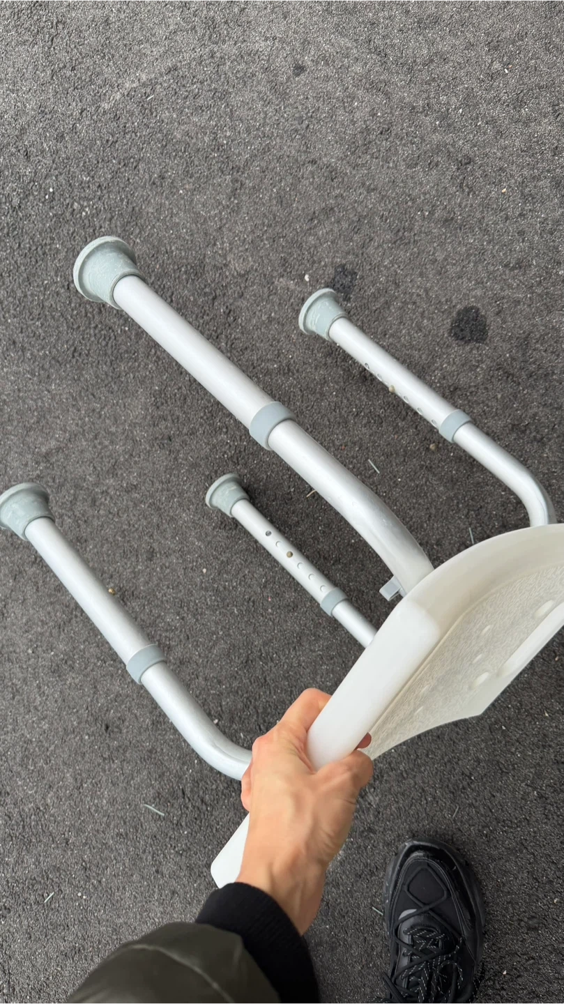 Selling a bath/shower chair with adjustable height legs. It's in good condition and ready to use! The chair is white with silver legs and features a textured seat with holes for drainage and handles on either side for easy grip and stability