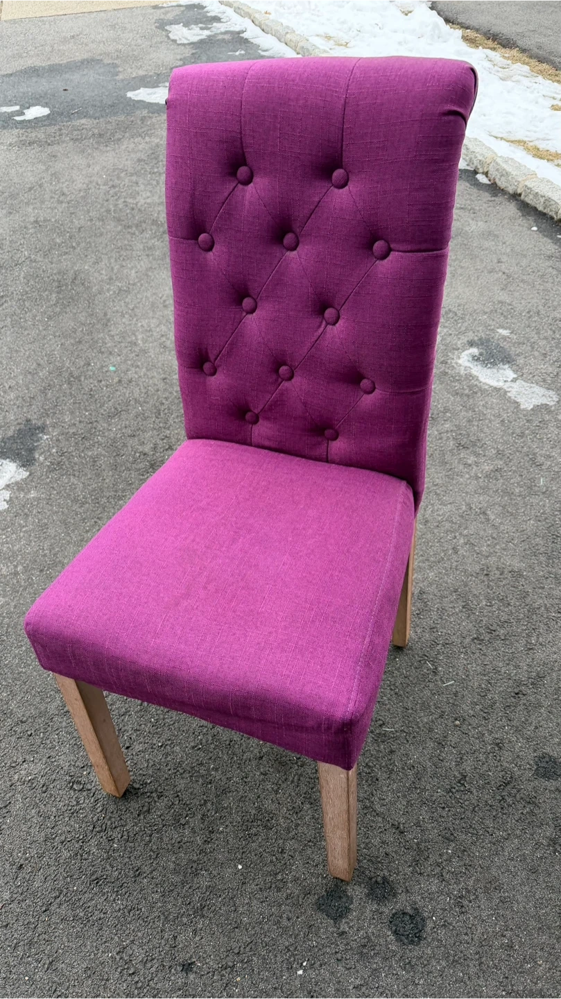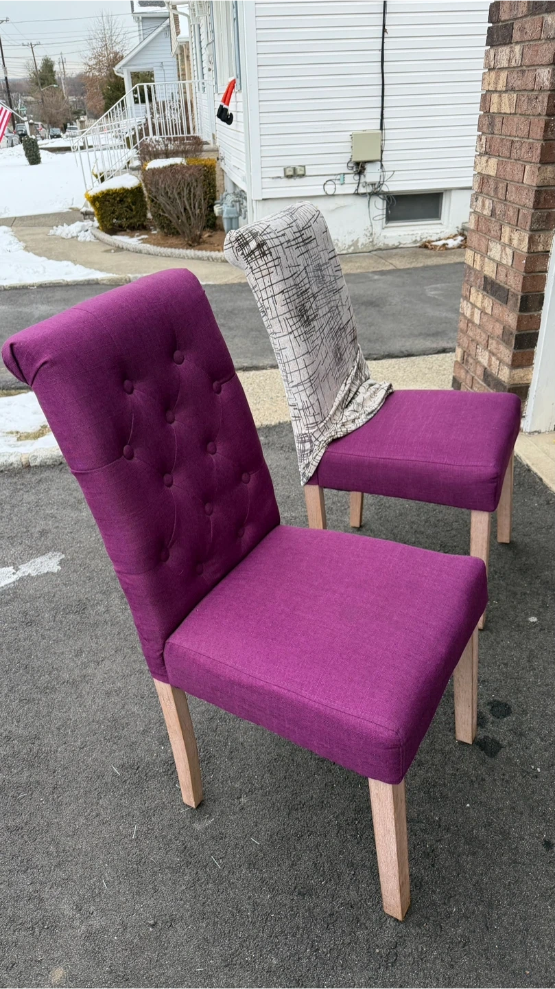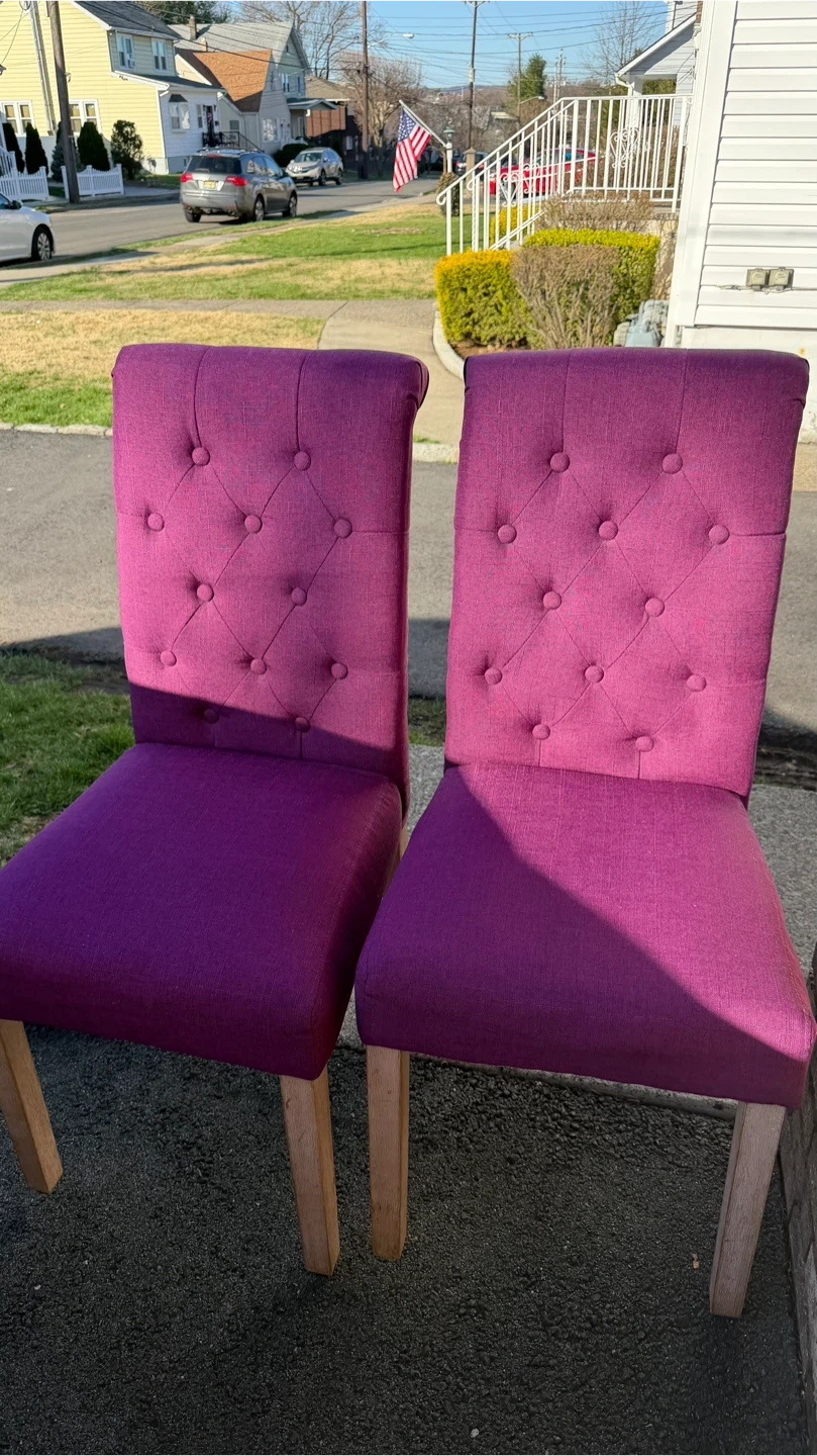 Selling a set of two dining chairs! Both are purple with button details and has a patterned fabric covering. They're in good condition and ready for a new home