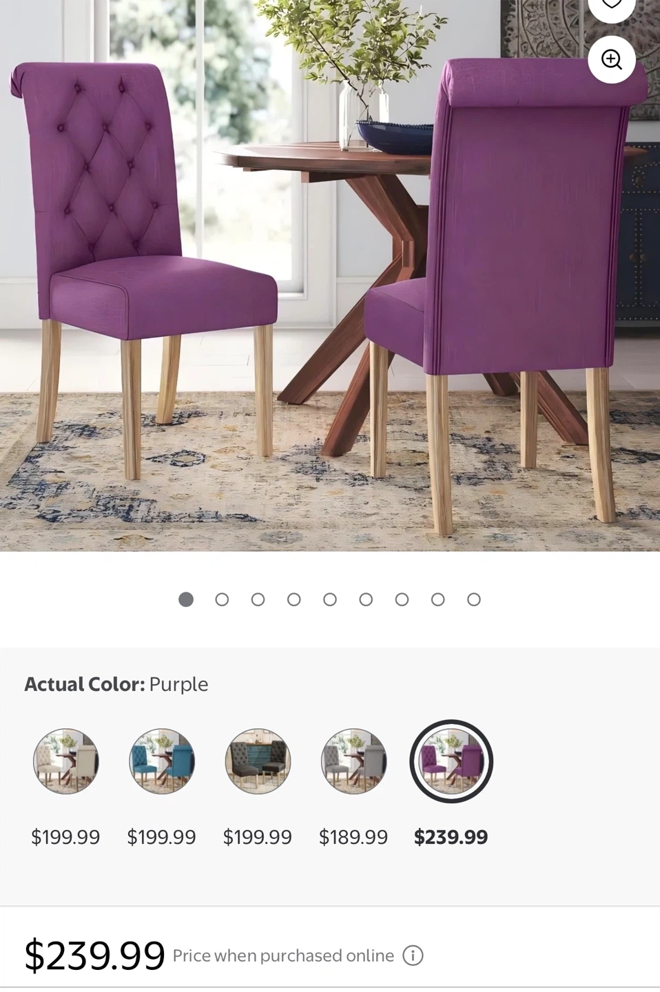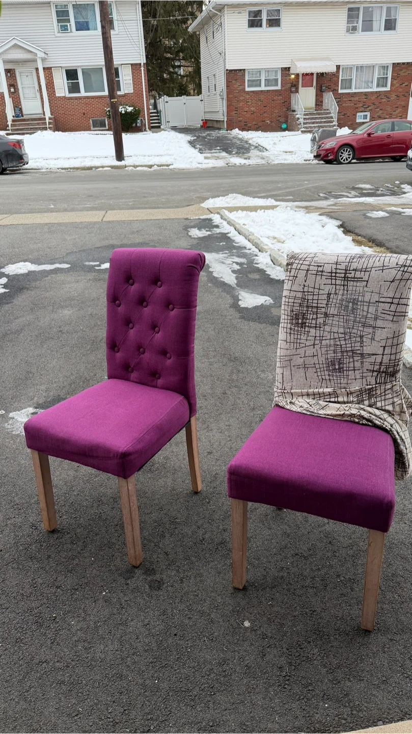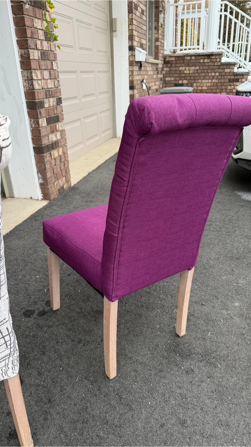 Selling a set of two dining chairs! Both are purple with button details and has a patterned fabric covering. They're in good condition and ready for a new home