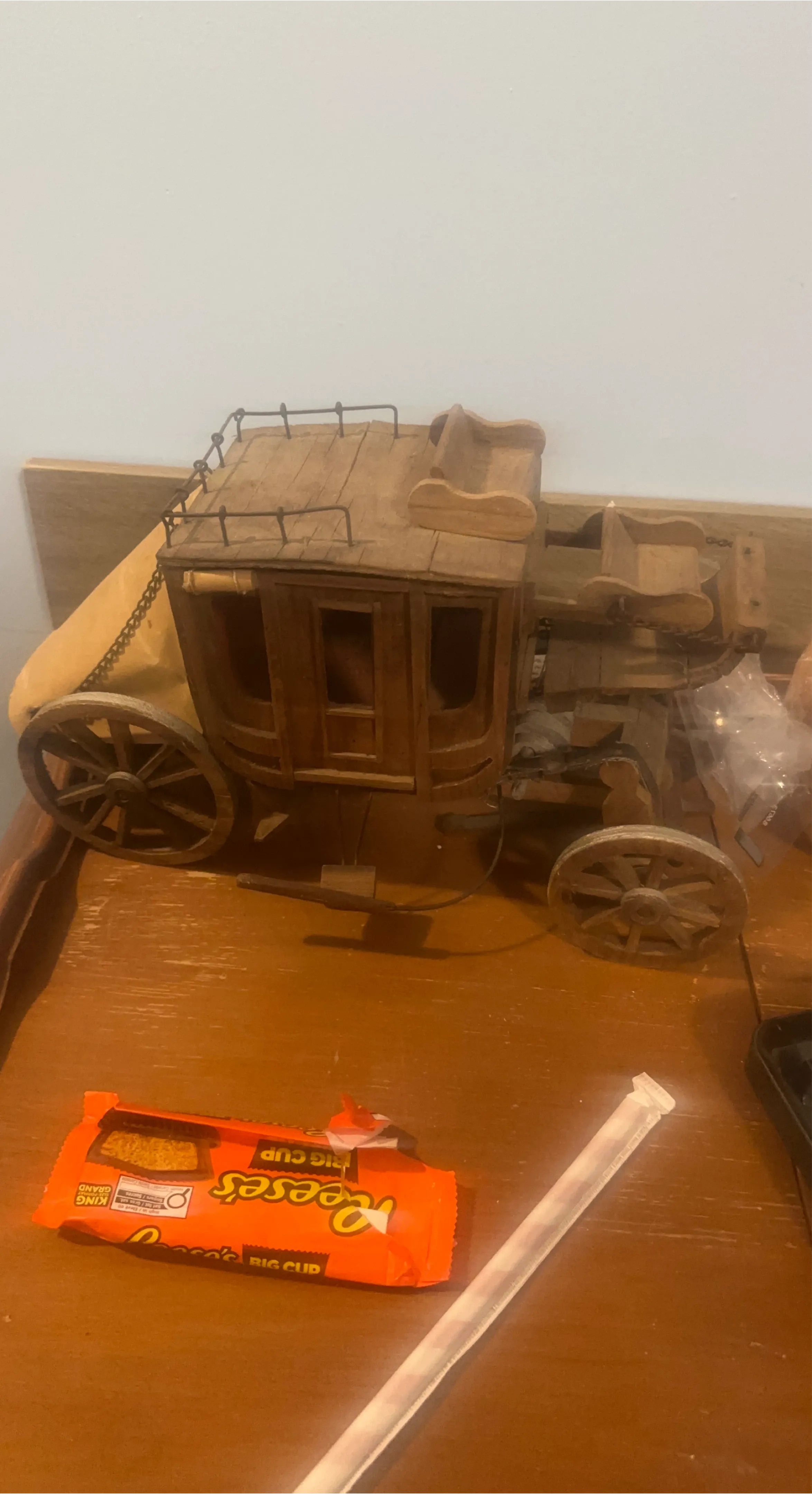 Here's a charming wooden stagecoach decoration! It's a unique piece that would look great on a shelf or desk. It's in good condition and has a nice, rustic feel to it