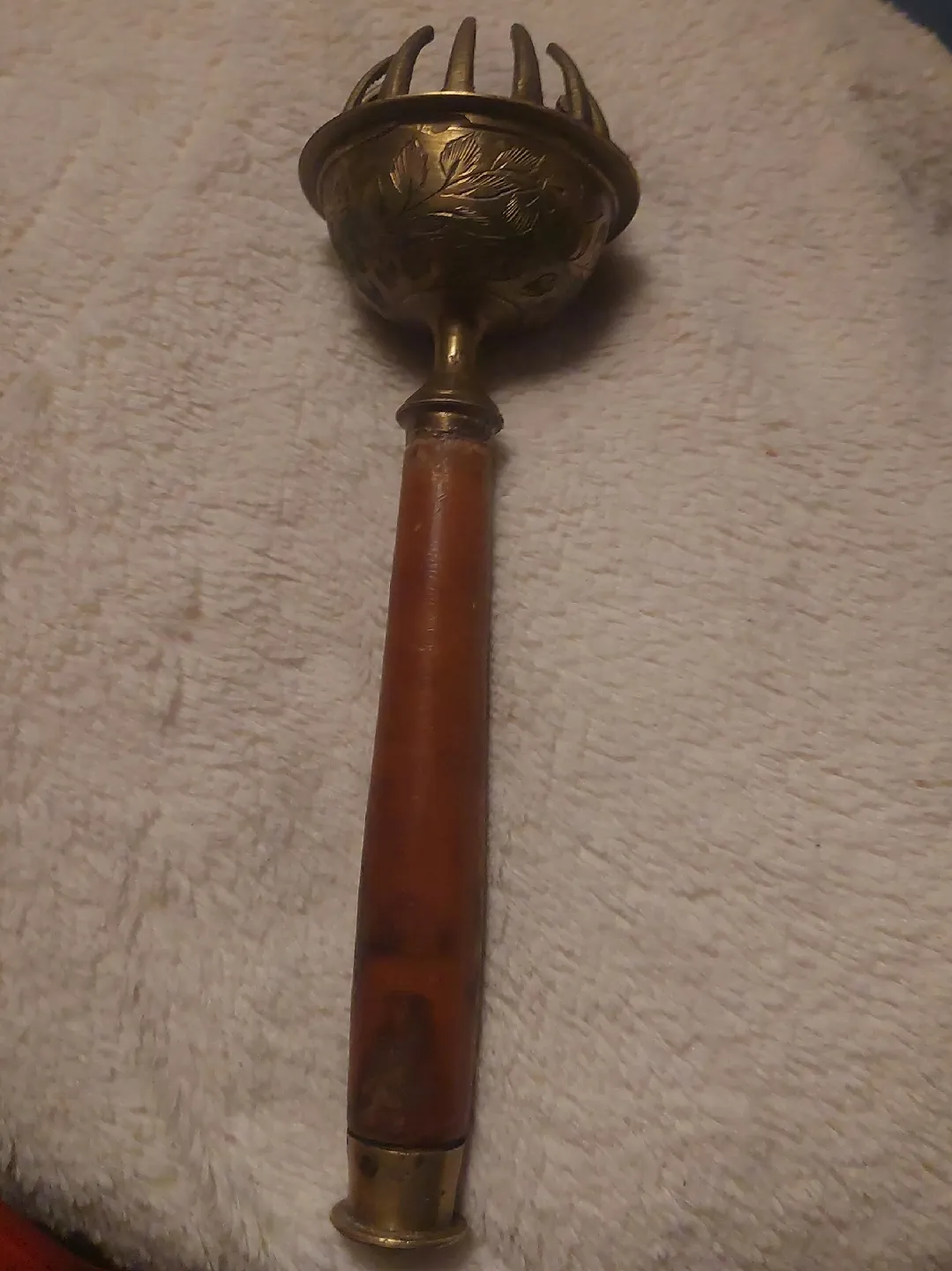 Selling a vintage brass head massager with a wooden handle. It has a unique design with floral engravings on the brass part. It shows some signs of wear, adding to its vintage charm!
