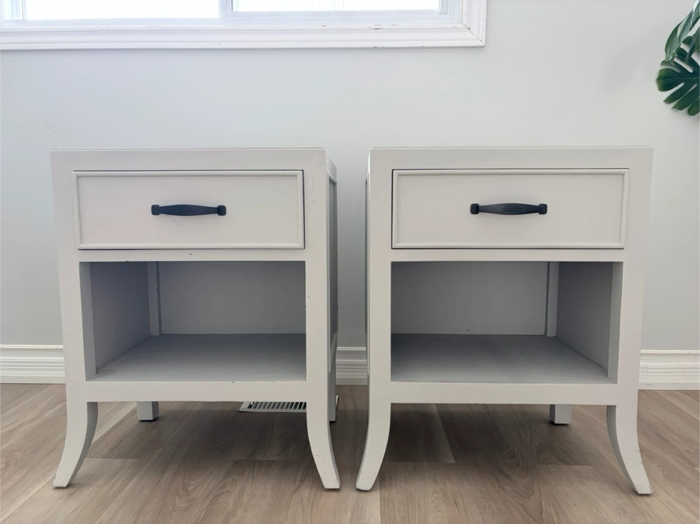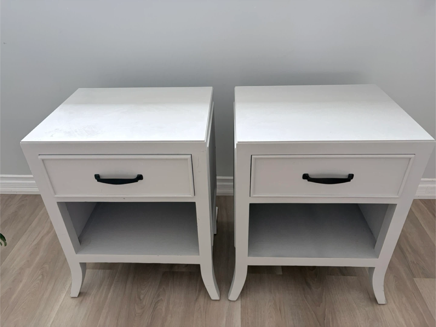 Selling a set of two white nightstands. They have a classic design with a drawer and an open shelf for storage. Great for adding a touch of elegance to your bedroom! 180 OBO
