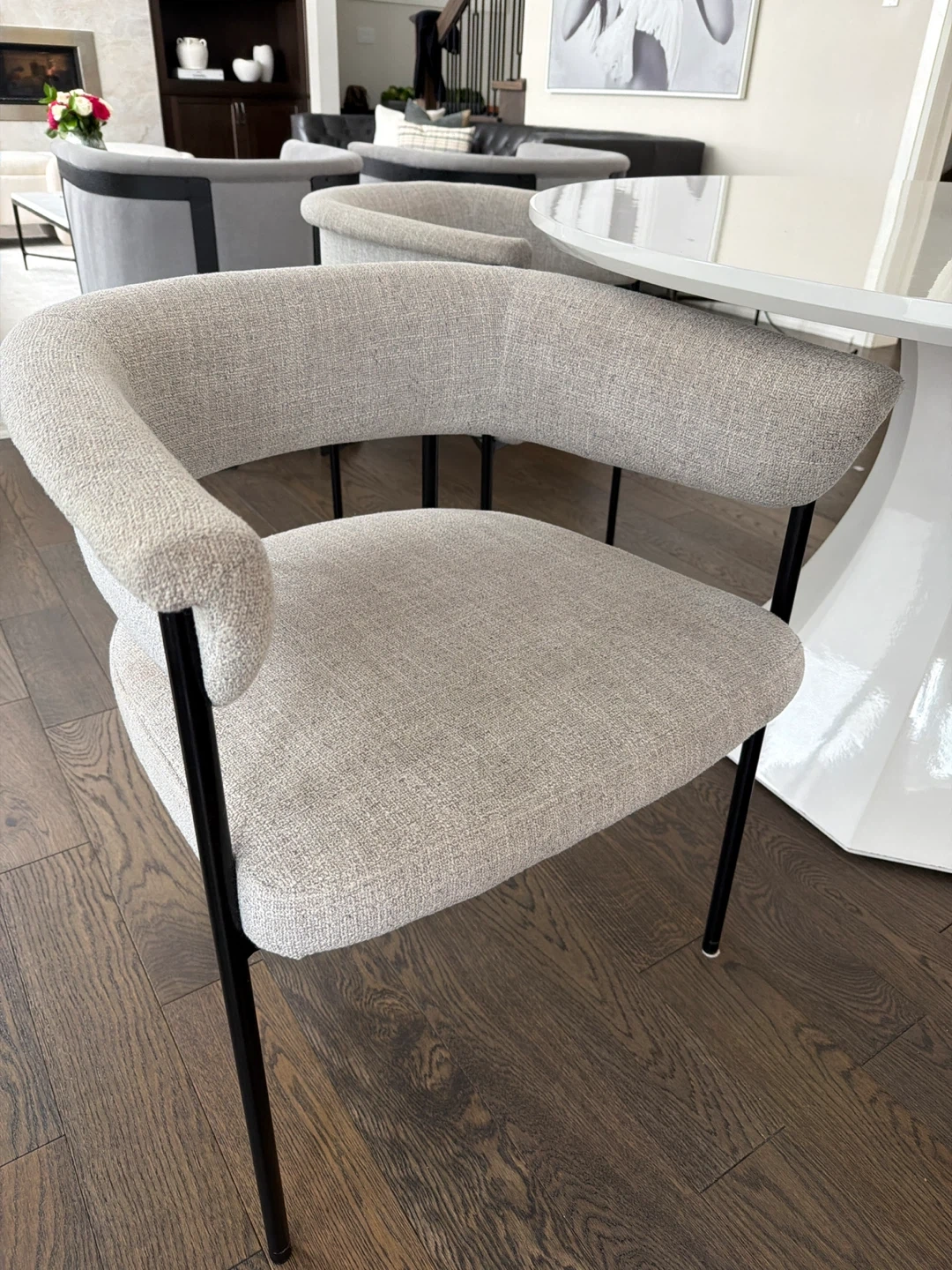 Selling a modern dining chair in great condition! The chair features a stylish grey fabric seat and back, complemented by sleek black legs. It's a comfortable and chic addition to any dining space. Perfect for adding a touch of elegance to your home! 6 in total