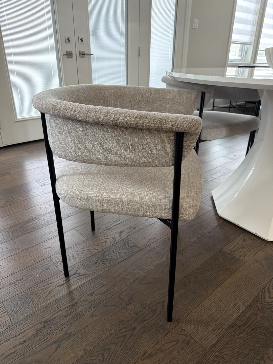 Selling a modern dining chair in great condition! The chair features a stylish grey fabric seat and back, complemented by sleek black legs. It's a comfortable and chic addition to any dining space. Perfect for adding a touch of elegance to your home! 6 in total