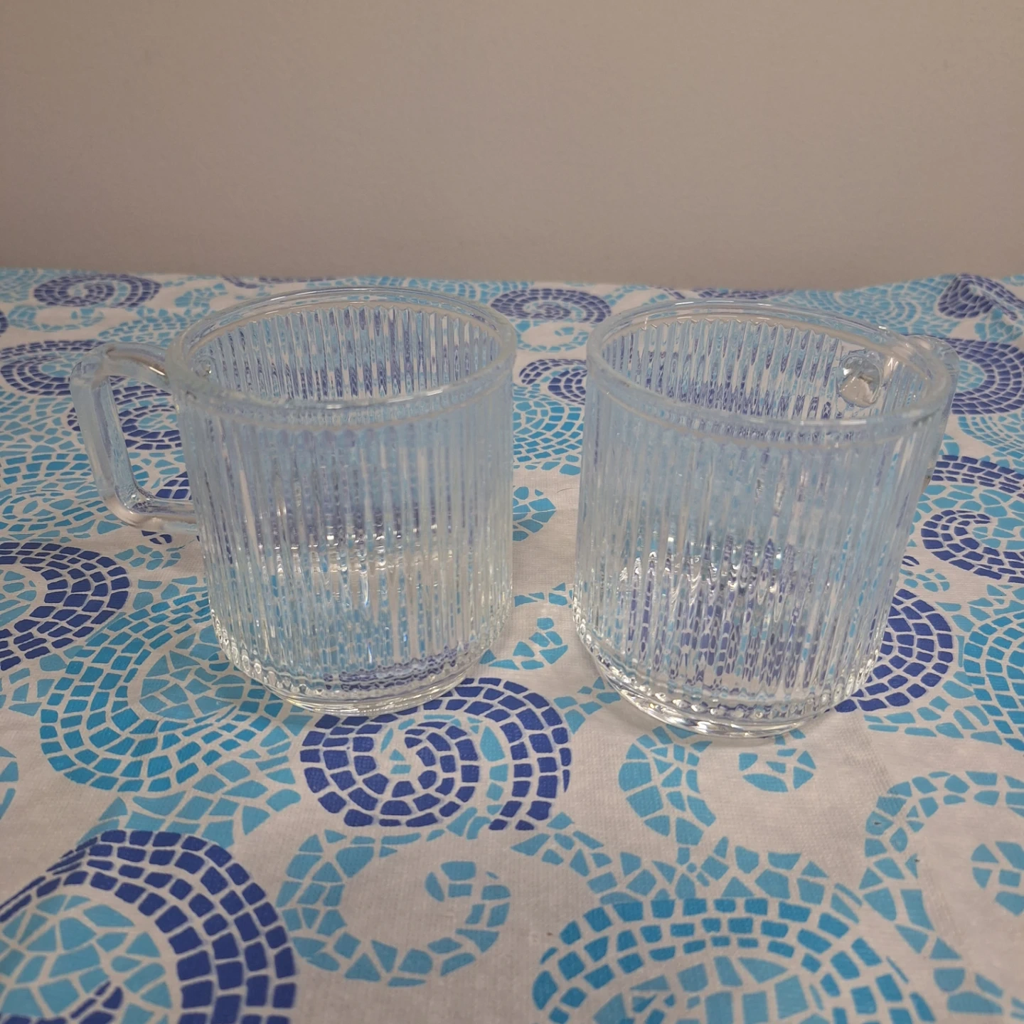 Selling a clear glass mugs set. Perfect for your morning coffee or tea! The set has a simple, elegant design with vertical ribbed detailing. In great condition and ready for a new home