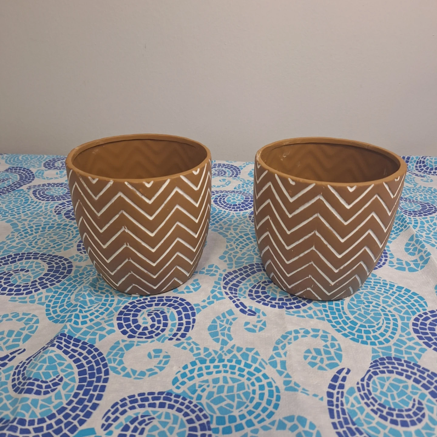 Selling a set of two matching brown ceramic planters. They have a unique white zigzag pattern that adds a nice touch to any room or garden. Perfect for small plants or succulents!