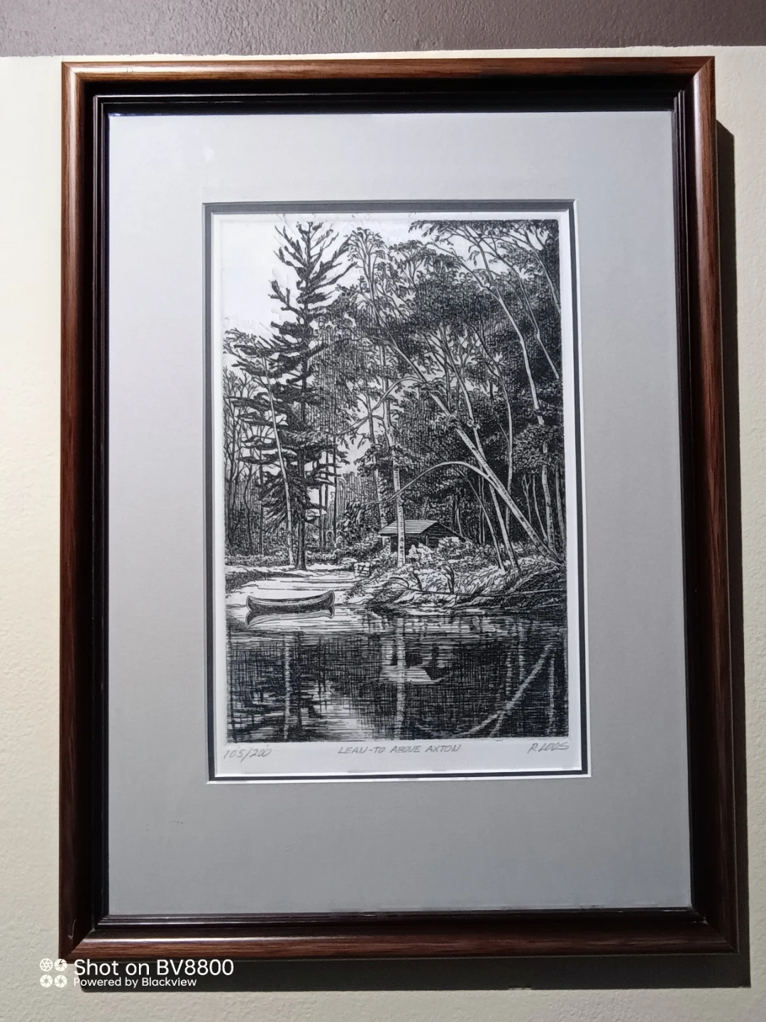 Selling a framed etching print titled "Lean-To Above Axton" by the artist R. Loos. This is a limited edition print, numbered 105/200. The etching depicts a serene waterside scene with a canoe and surrounding forest landscape. It's a beautiful piece of art!