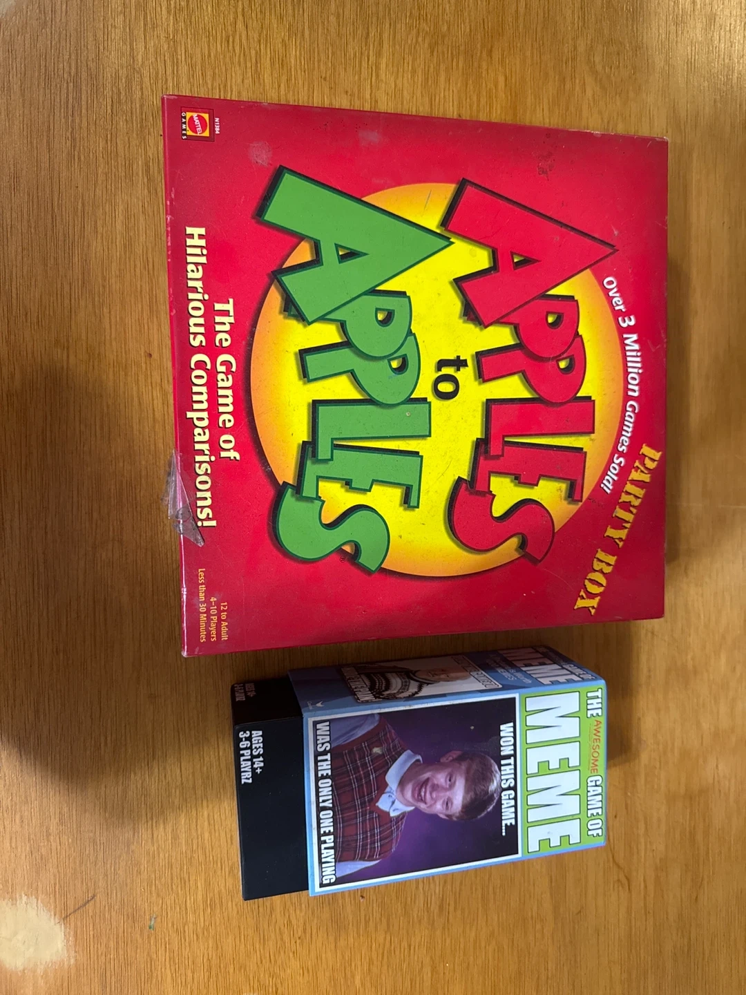 Selling a bundle of two fun party games! Included is Apples to Apples, the game of hilarious comparisons, suitable for 12 to adult, 4-10 players, with game time less than 30 minutes. Also includes What Do You Meme?, the awesome game of memes, for ages 14+ and 3-6 players