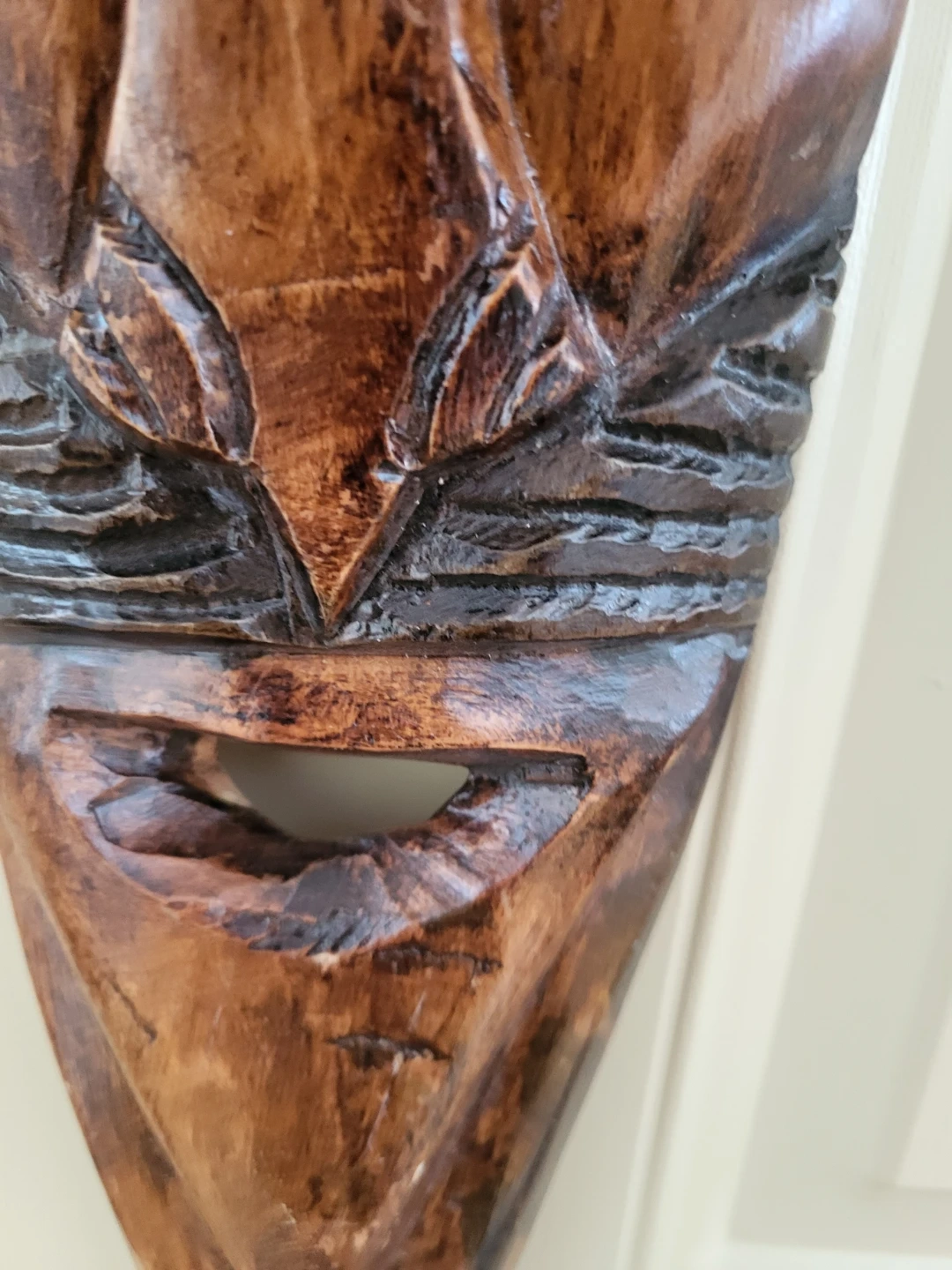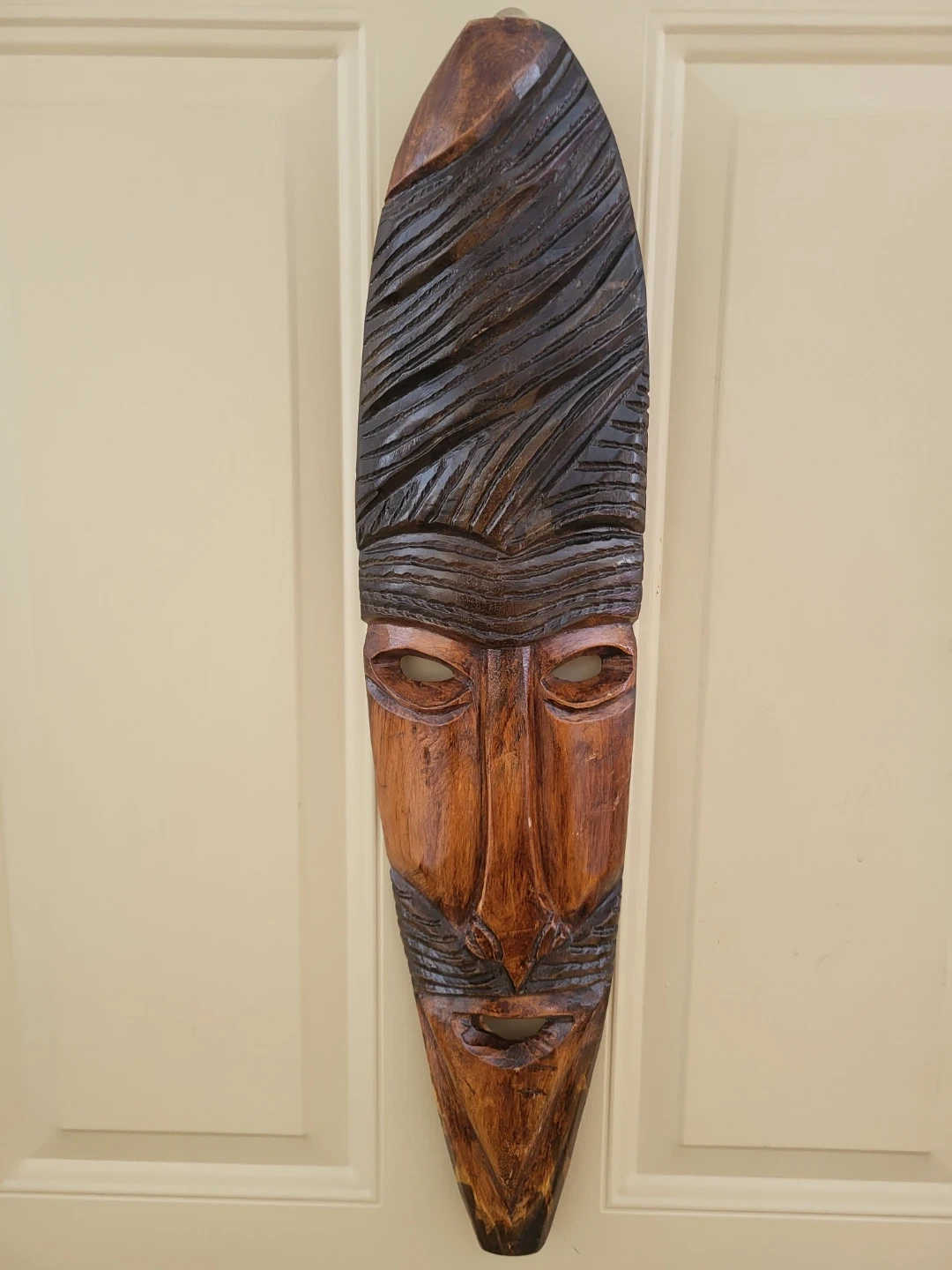 Unique hand carved wooden mask, perfect for adding a touch of character to your home! It has a beautiful dark brown finish and intricate details. Ready to find a new home!