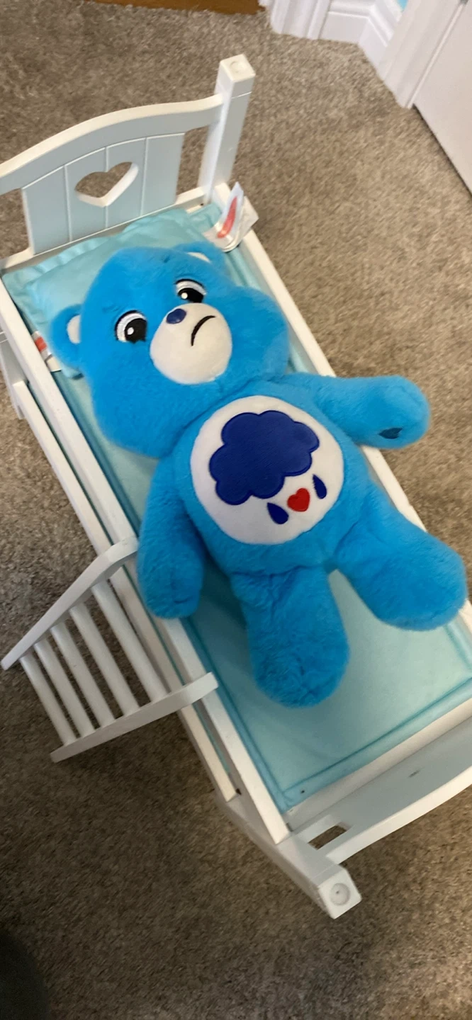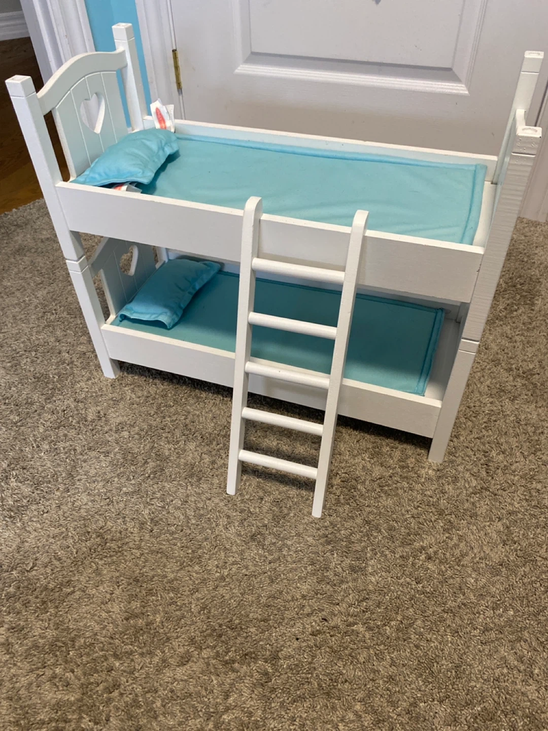 Selling a doll bunk bed with a ladder. It's in great condition and perfect for your little one's dolls! Comes with two little pillows and two blue mattresses. (Care bear is just to show the size.)