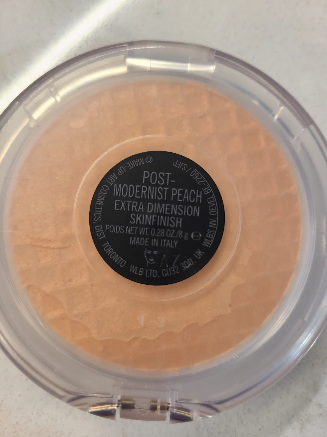 MAC Extra Dimension Skinfinish in the shade Post-Modernist Peach! It's a beautiful highlighter that gives your skin a lovely glow.