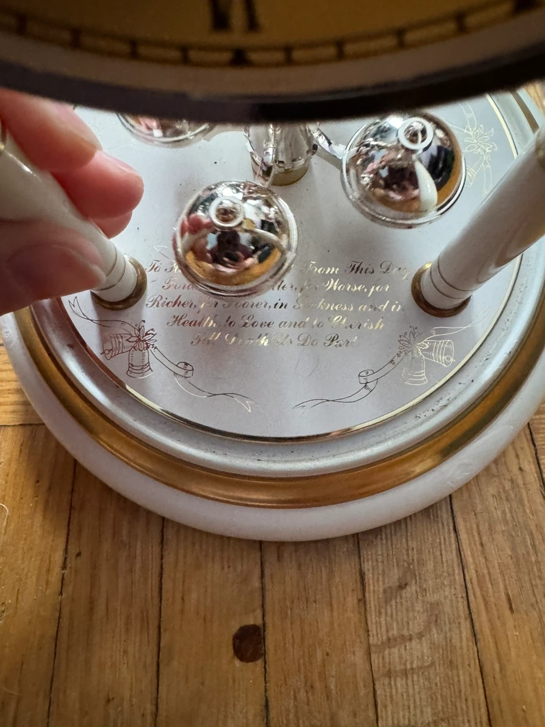 Beautiful Konig anniversary clock in great condition! It features a glass dome and a pendulum with rotating silver balls. The clock face has Roman numerals and decorative floral accents. A lovely addition to any home!