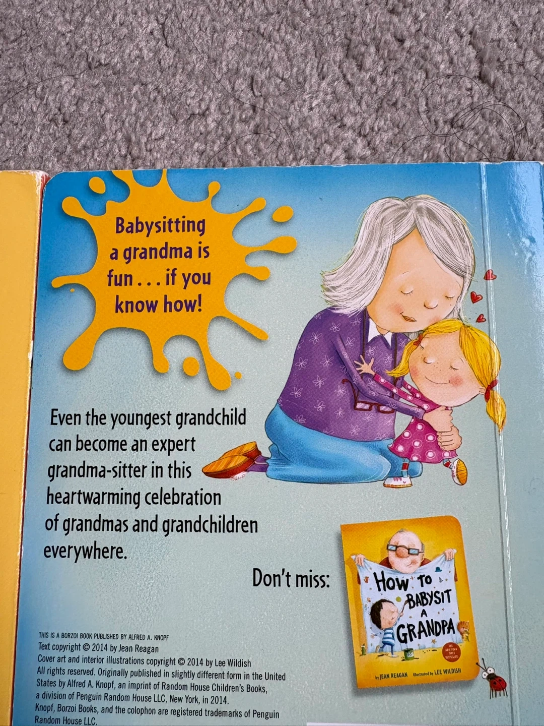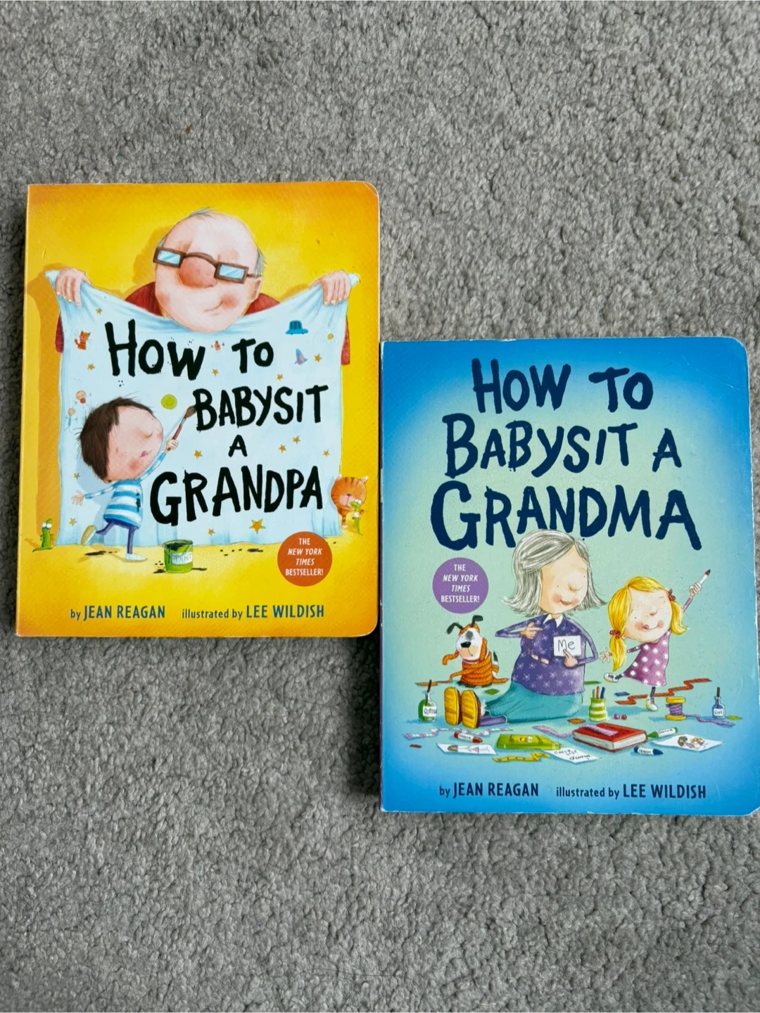 a set of two children's board books: "How to Babysit a Grandma" and "How to Babysit a Grandpa"! They are written by Jean Reagan and illustrated by Lee Wildish. These books are a fun and heartwarming celebration of grandparents and grandchildren everywhere.