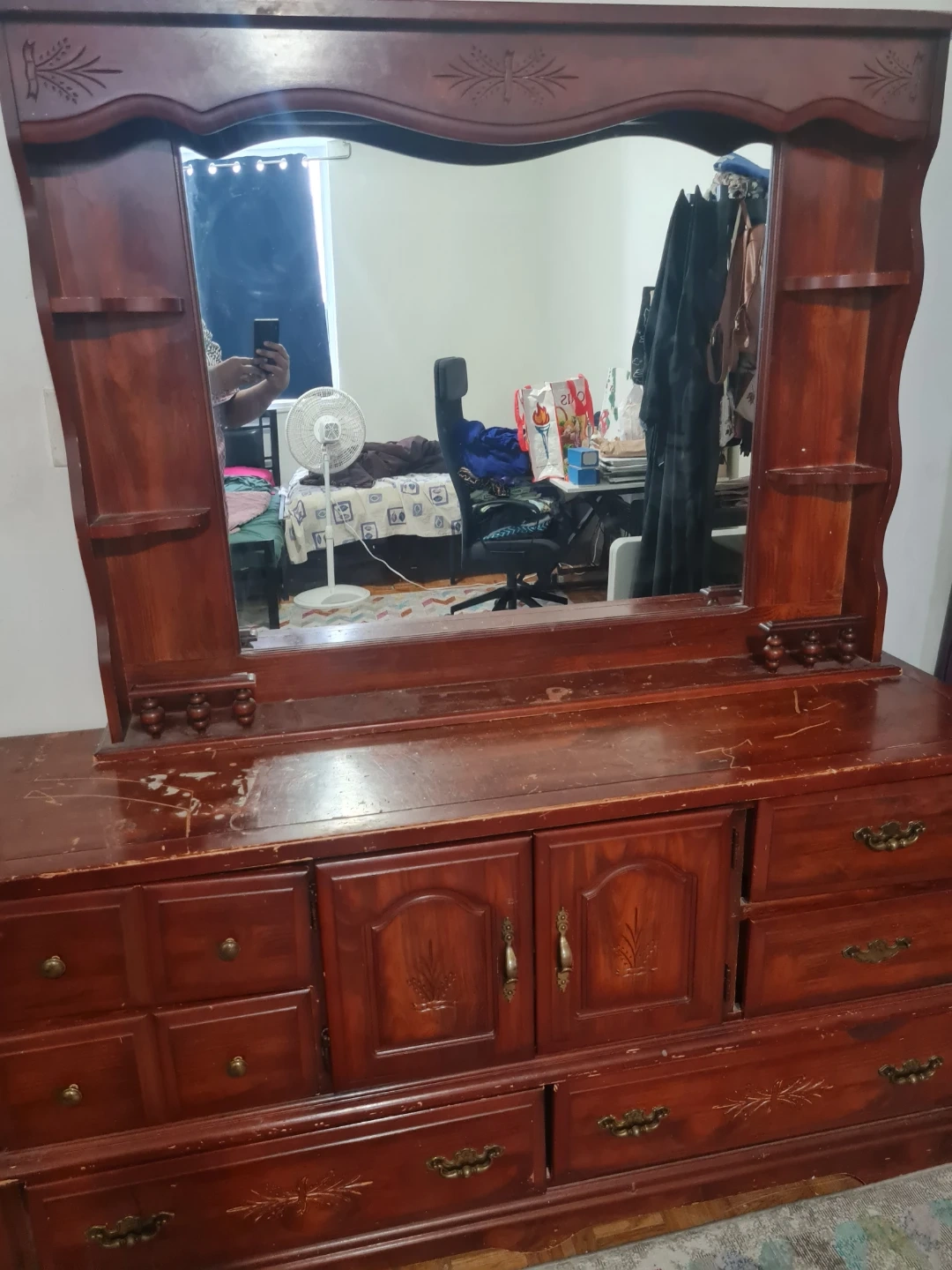 Selling a wooden dresser with a mirror. It has some visible wear and tear, as shown in the photos. Perfect for adding storage and a classic touch to your bedroom!
