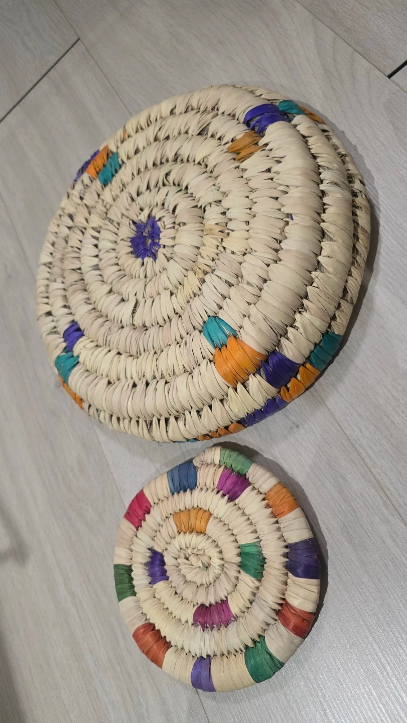 Selling a set of woven straw tray and coaster. The tray measures about 24cm in diameter, and the coaster is about 10cm. They add a nice natural touch to any table setting.