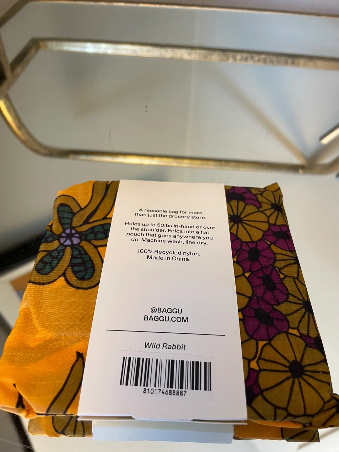 BAGGU standard reusable bag in the Wild Rabbit print! This bag is made of 100% recycled nylon and can hold up to 50lbs. It folds into a flat 5" × 5" pouch for easy storage. You can carry it in your hand or over your shoulder. Machine wash and dry