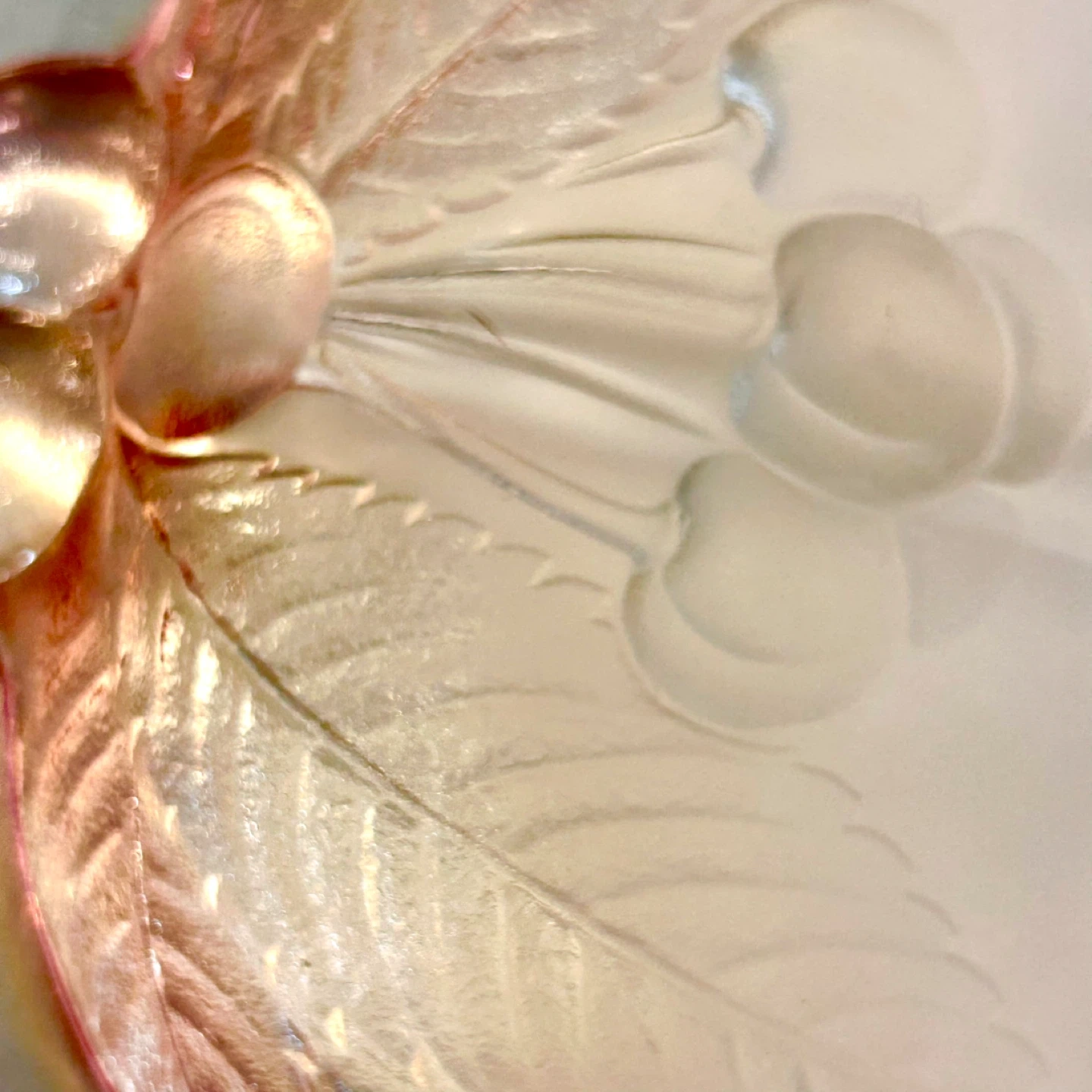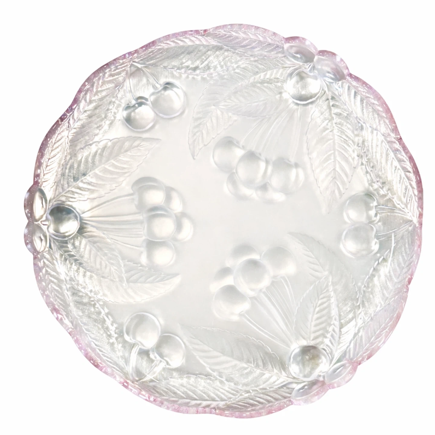 A substantial, heavy crystal platter with high-relief cherries and foliate decoration over a satin-frosted ground, finished with a delicate blush-pink rim and softly scalloped edge. The modeling is crisp and dimensional, giving the surface a luminous, sculptural quality under light.