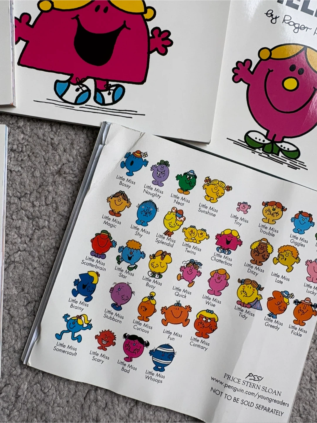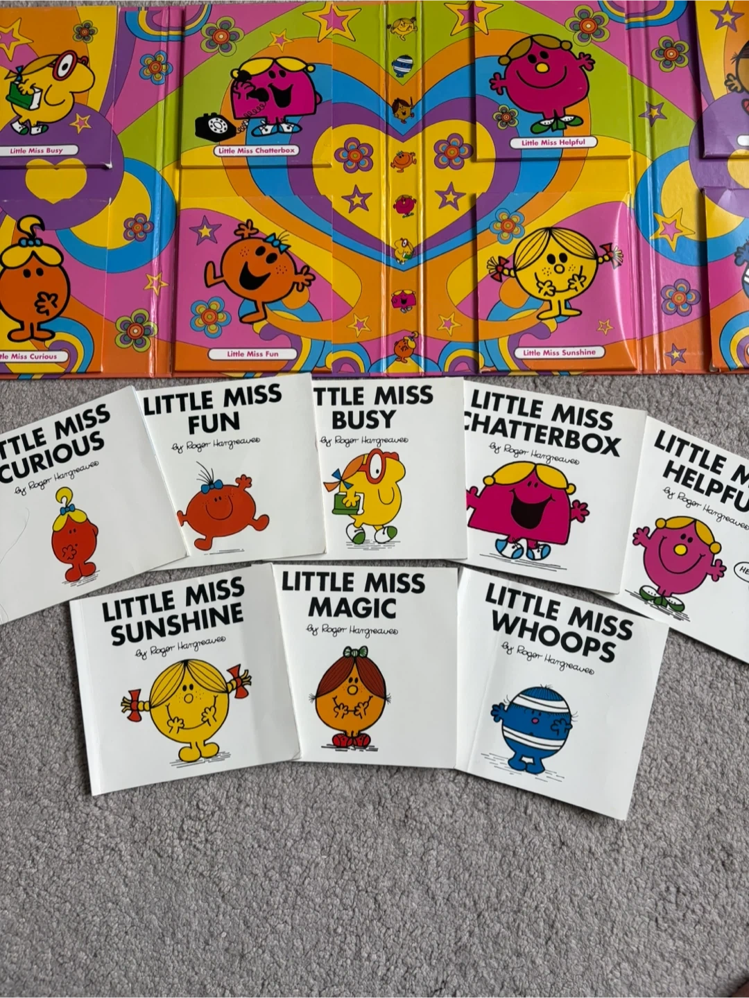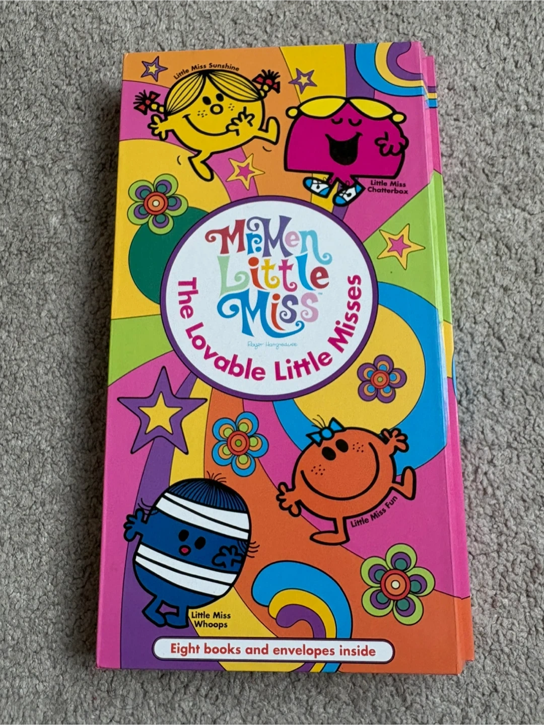 The Mr. Men Show Little Miss 8 mini Book Set. Features Little Miss Curious, Fun, Busy, Chatterbox, Helpful, Sunshine, Magic, and Whoops. Books by Roger Hargreaves. Great for young readers!
