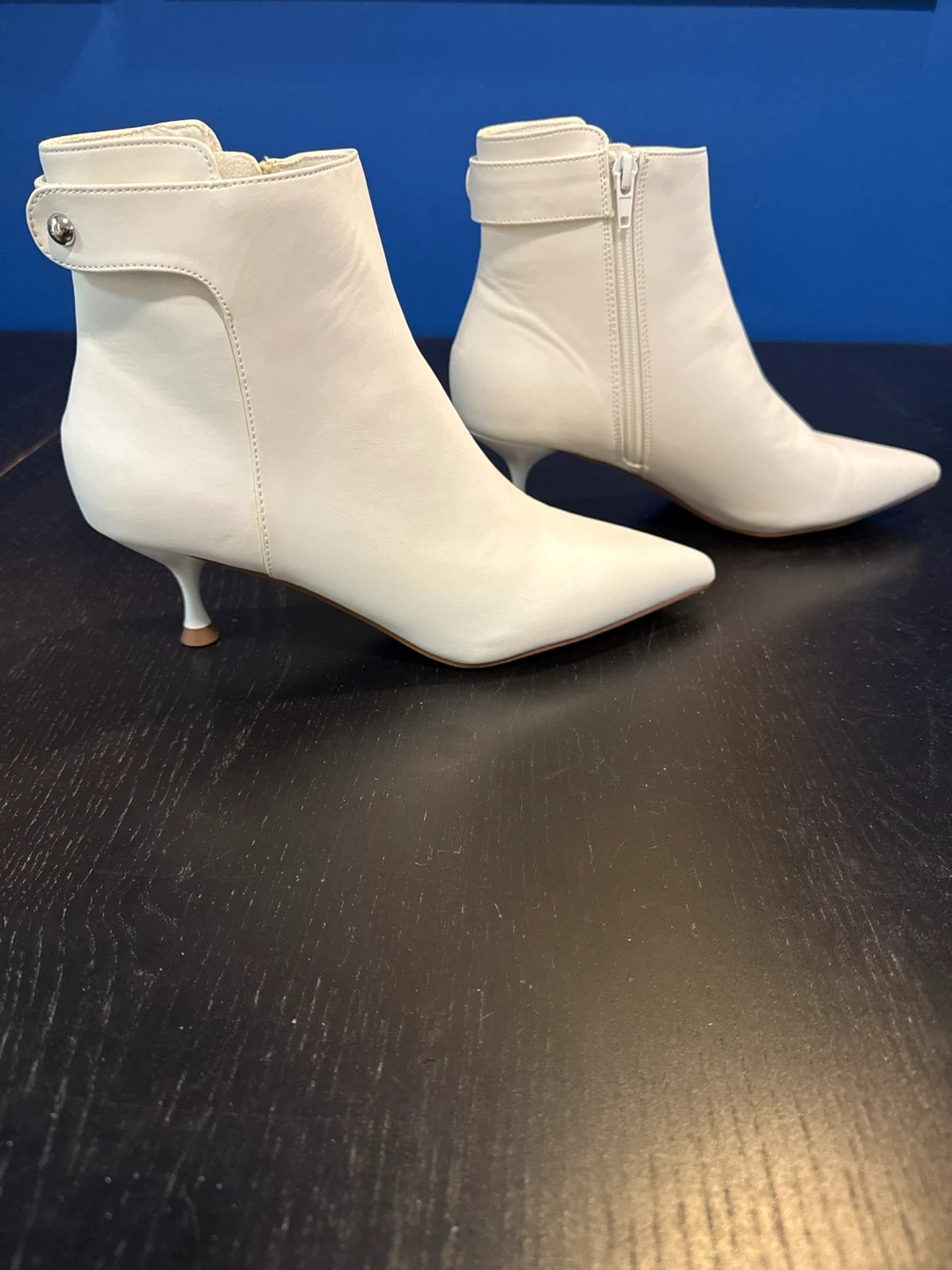 Selling white pointed-toe ankle boots with a kitten heel. These stylish boots feature a side zipper and decorative buckle detail.