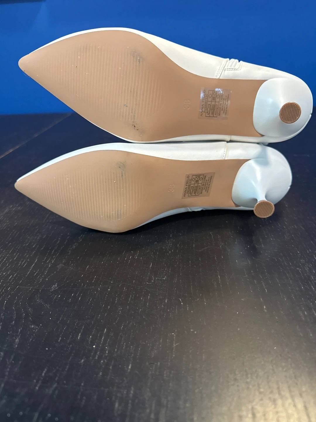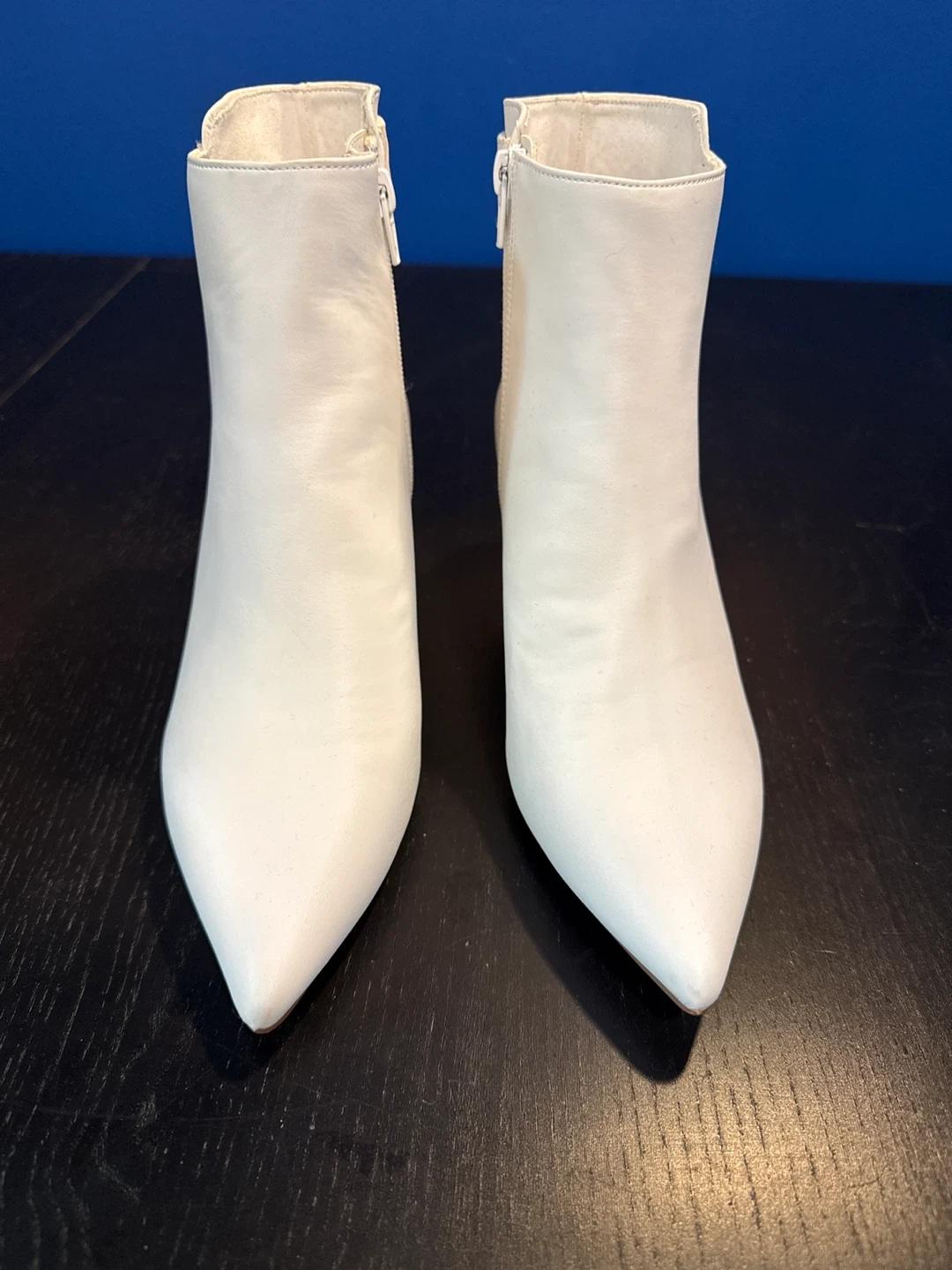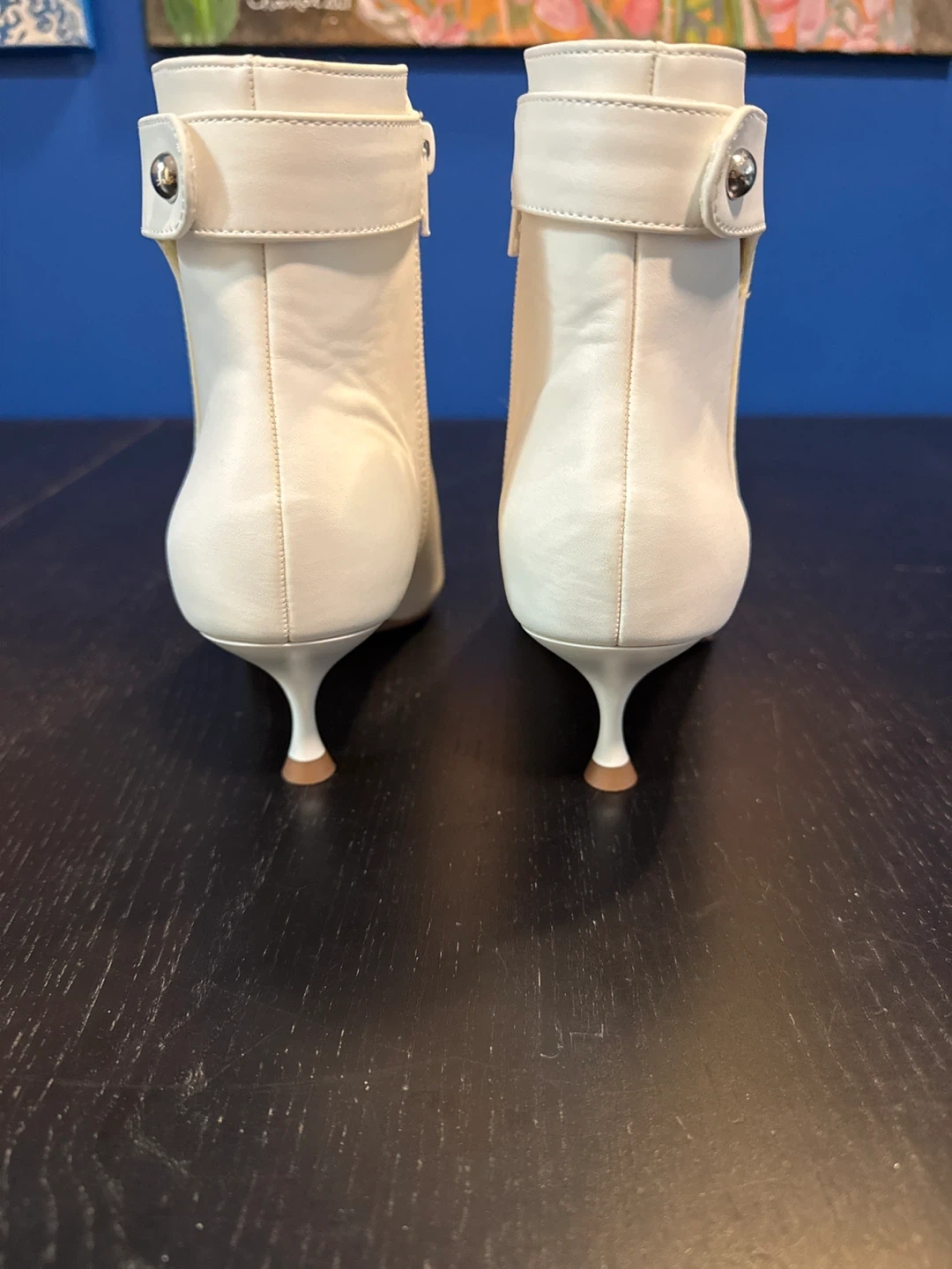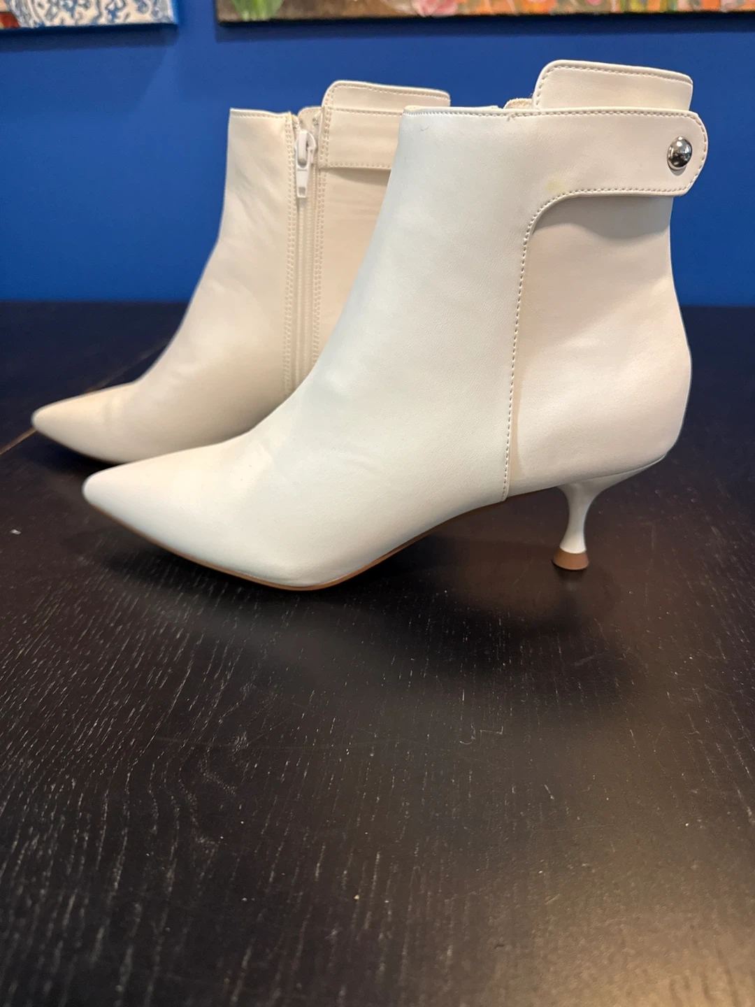 Selling white pointed-toe ankle boots with a kitten heel. These stylish boots feature a side zipper and decorative buckle detail.