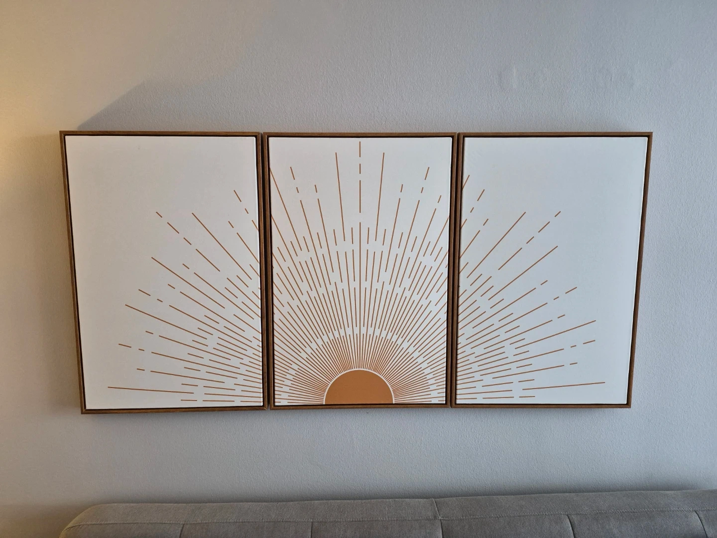 Selling a set of three framed canvas wall art pieces featuring a modern sunburst design. The canvases have a white background with copper-toned lines and a copper sun. They're framed in a neutral wood tone.
