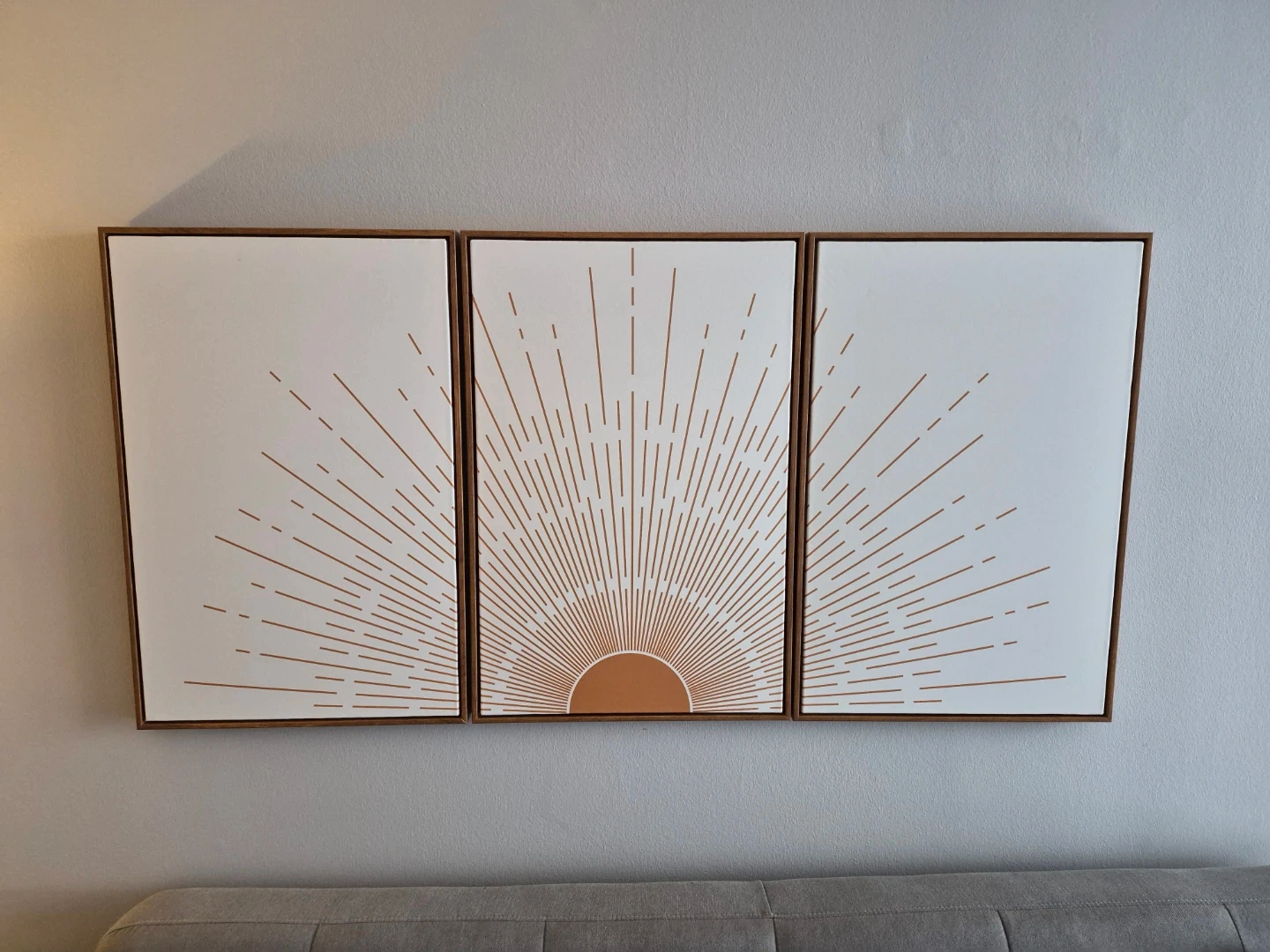 Selling a set of three framed canvas wall art pieces featuring a modern sunburst design. The canvases have a white background with copper-toned lines and a copper sun. They're framed in a neutral wood tone.