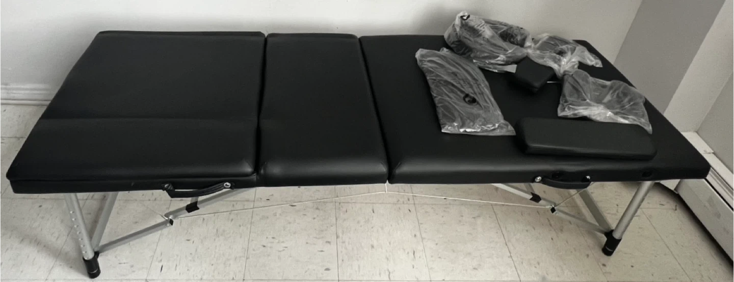 Selling a Greenlife folding massage table. Black upholstery and aluminium frame. Includes armrest and headrest accessories. Folds up into a carrying case for easy transport!