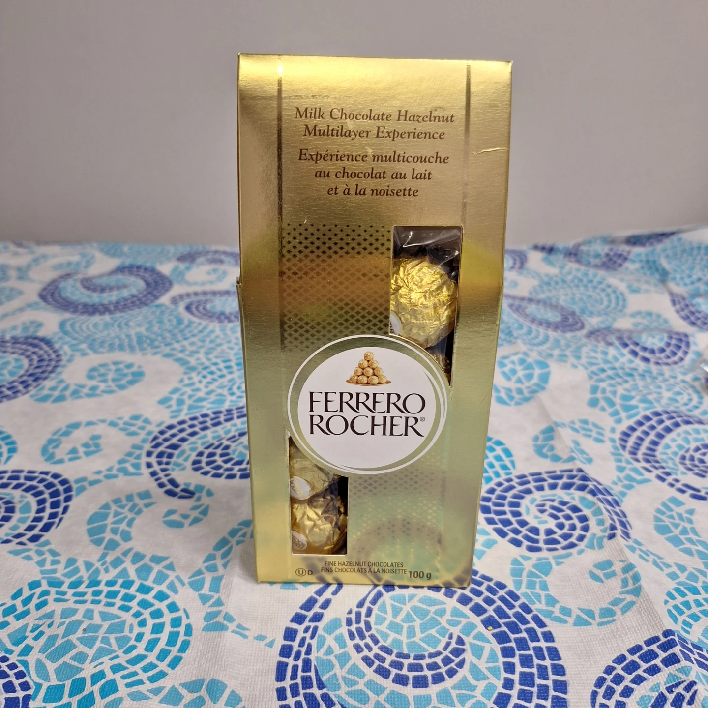 Selling a 100g box of Ferrero Rocher Milk Chocolate Hazelnut multilayer experience. Contains milk chocolate, hazelnuts, and wafer. Enjoy this sweet treat!