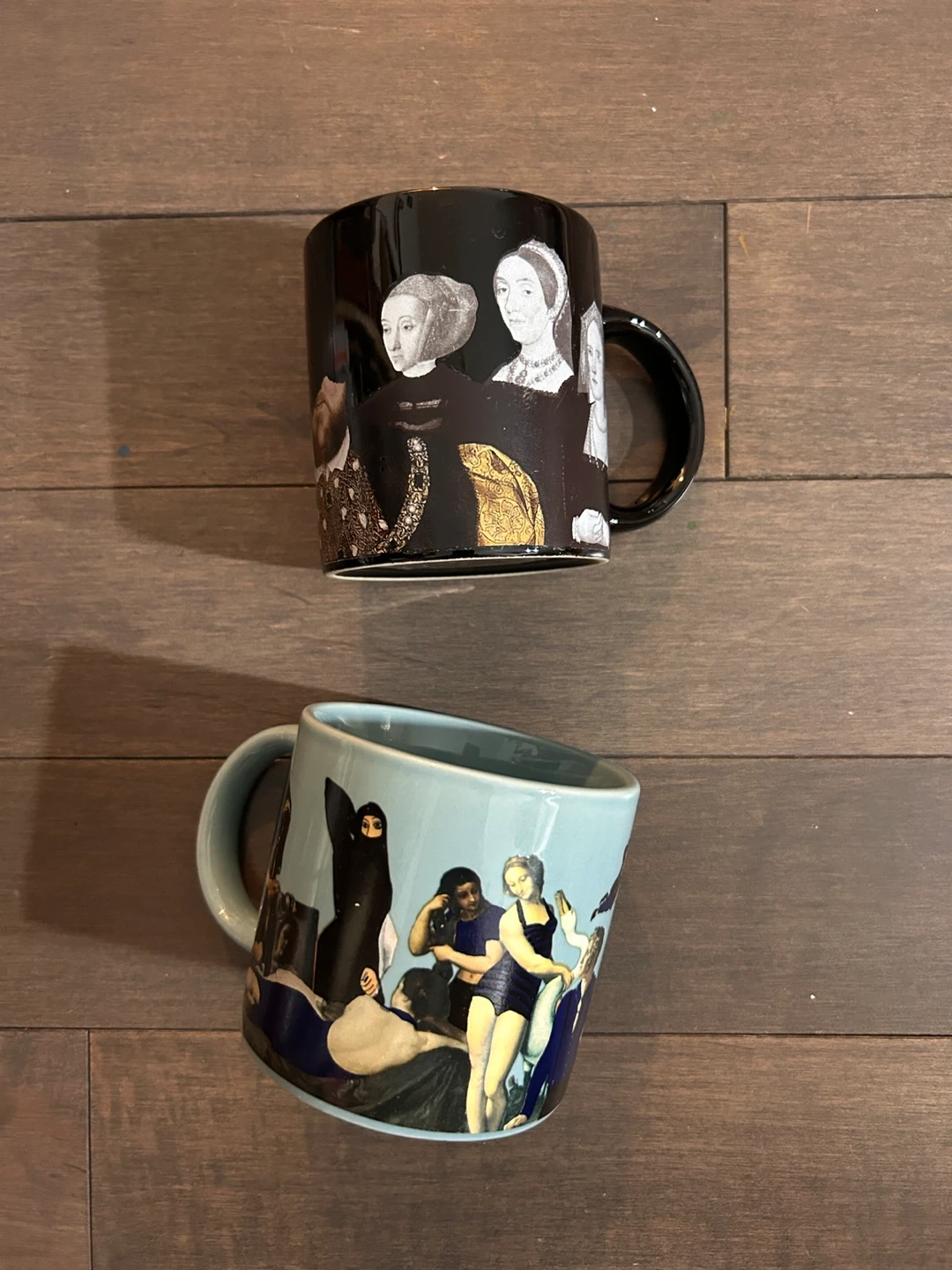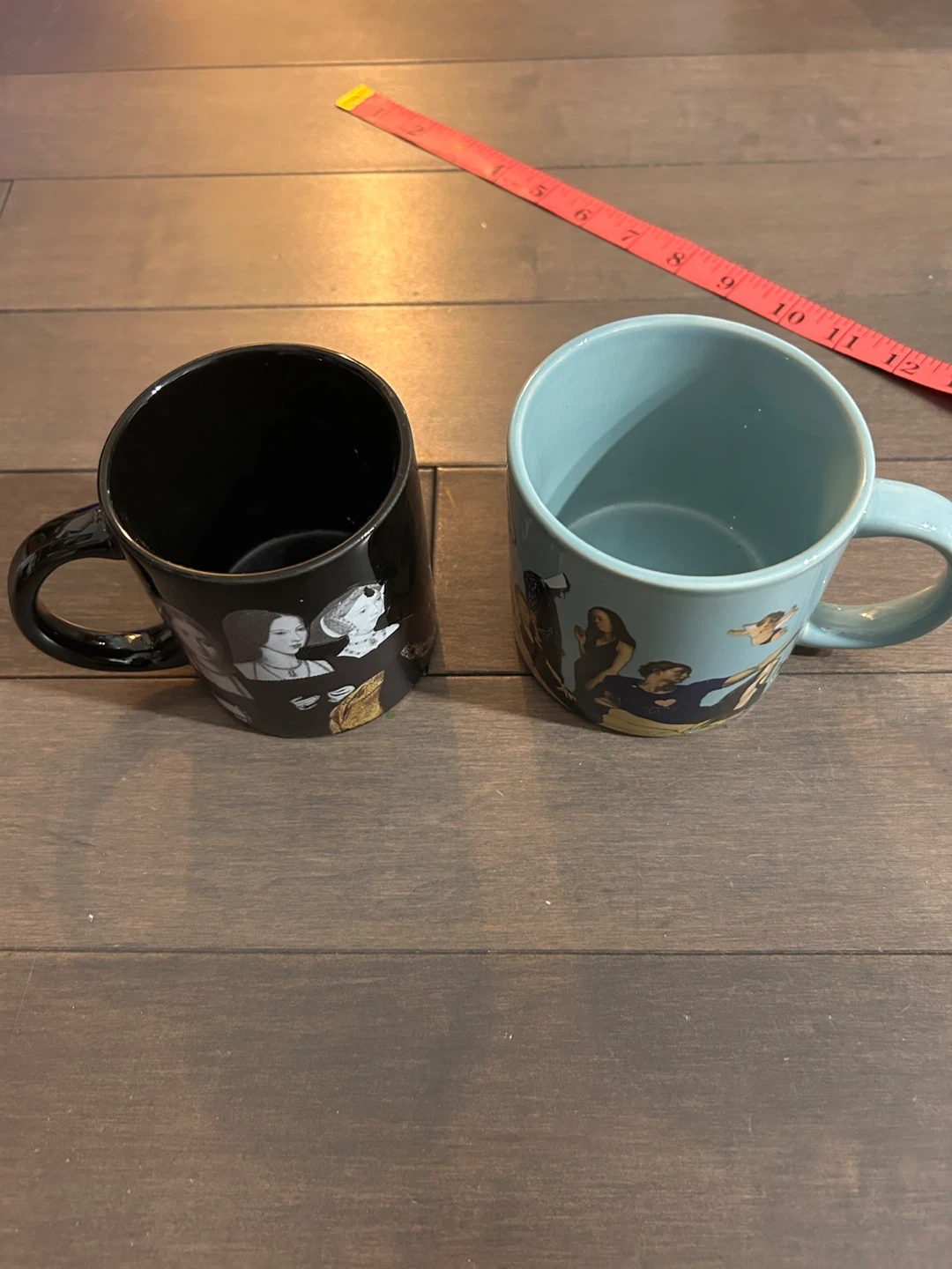 Price is for both. Selling two mugs from The Unemployed Philosophers Guild. The black mug is titled "Henry VIII Disappearing Wives Mug" and the blue mug is titled "Great Nudes". Both are ceramic and should be hand-washed only. They were made in 2012. A fun artistic set for your collection!