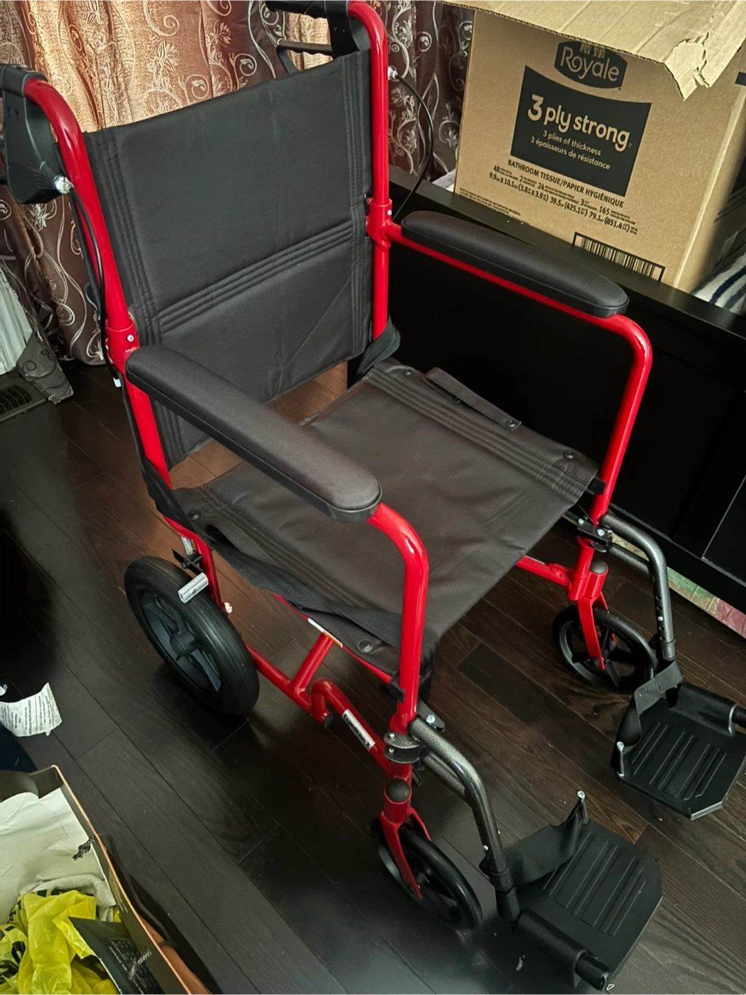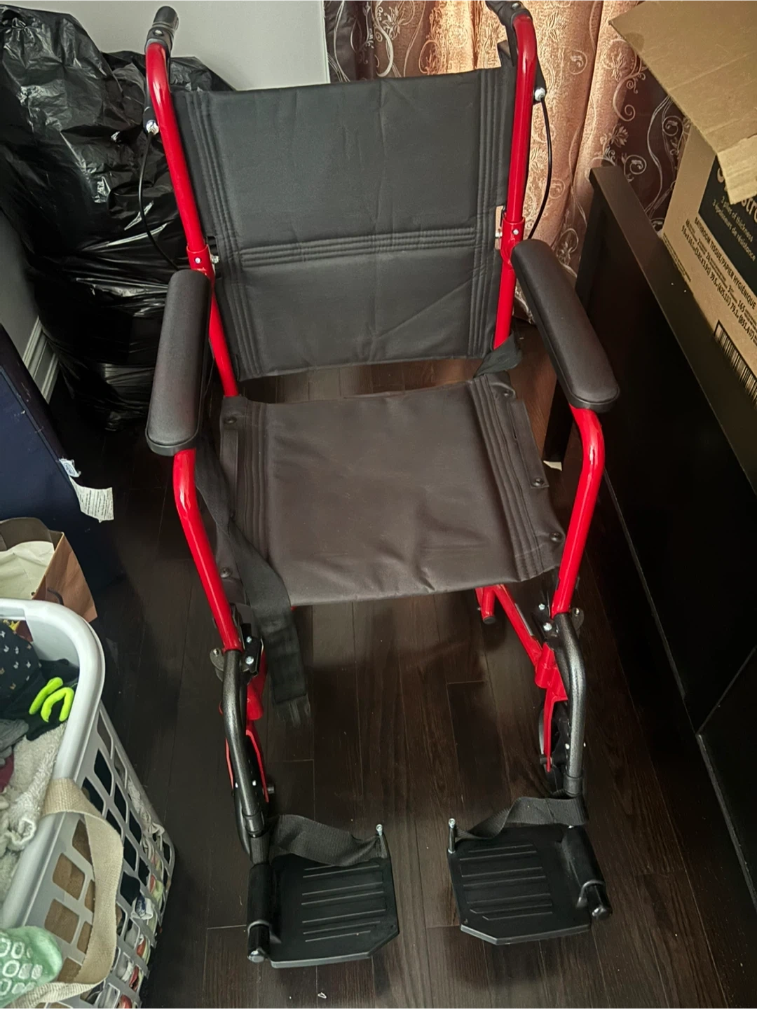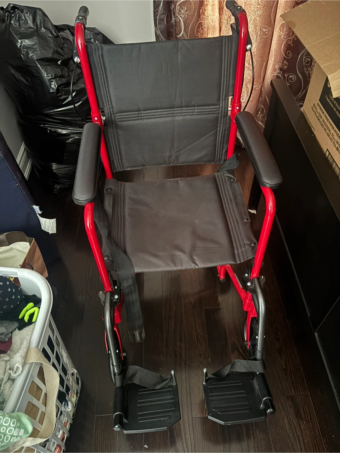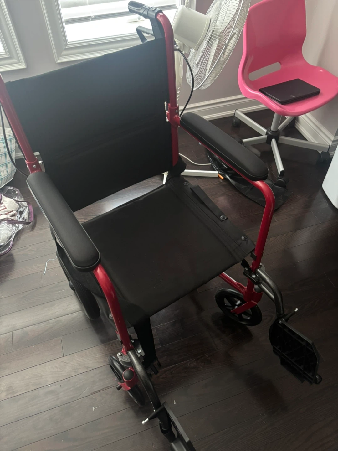 Selling a red lightweight transport wheelchair. It has a durable frame and comfortable seating. Features footrests for added support. Great for getting around!